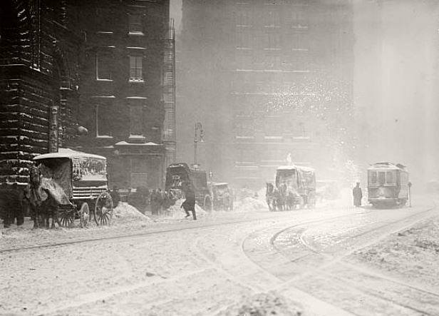 Гужевые повозки на заснеженной улице Нью-Йорка, 1910-е годы.