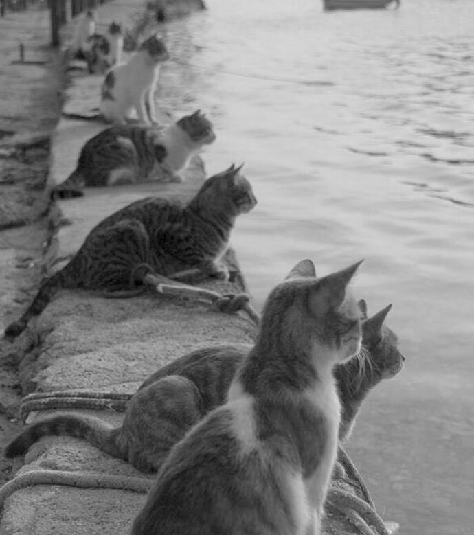 Бездомные кошки с нетерпением ожидают возвращения рыбаков, Греция, 1970-е.