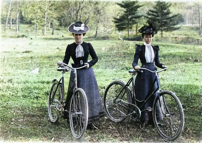 Две женщины остановились во время велосипедной прогулки по району Скенектади, США, около 1900 года.