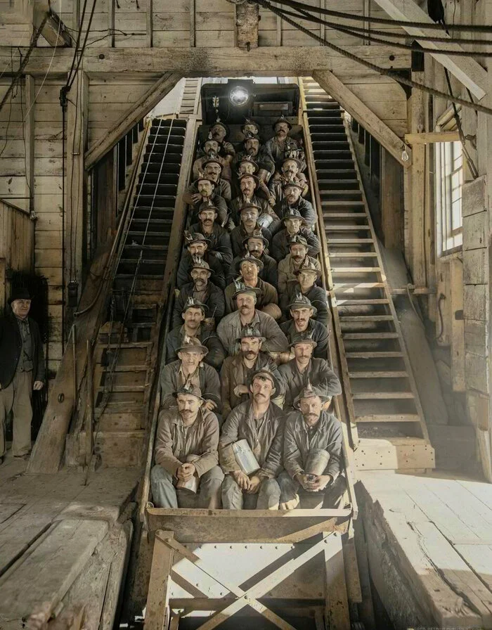 Рабочие Calumet и Hecla Mining Company в Мичигане готовятся к долгому спуску в медные рудники на работу, 1906 год.
