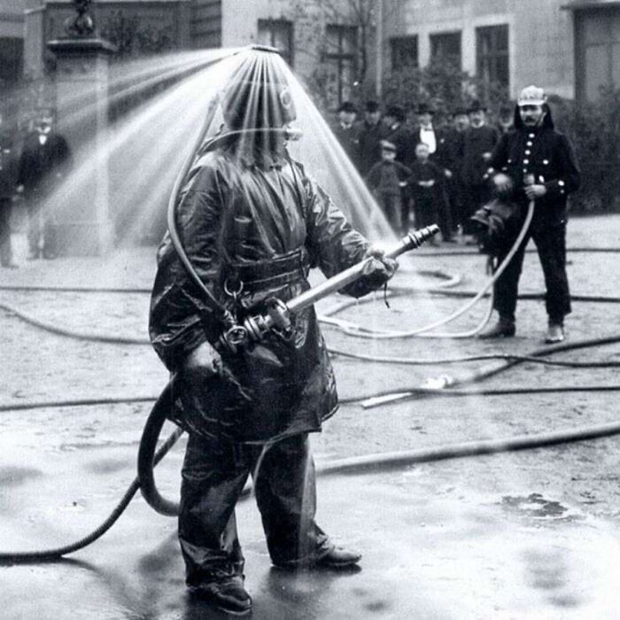 Начало 1900-х. Экспериментальный костюм пожарного с персональным разбрызгивателем. Технологии, которые сегодня кажутся наивными и пугающими одновременно.