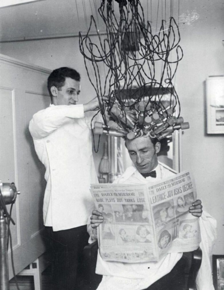 Джентльмен читает газету, пока ему делают прическу в парикмахерской, примерно 1950-е годы