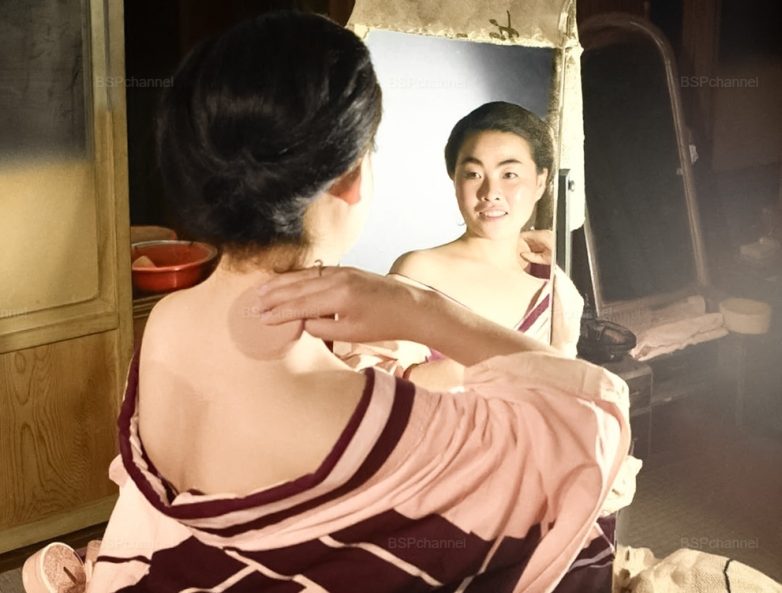Гейша Харукома (профессиональное имя Эцукэ) наносит белый макияж, характерный для гейш, готовясь к вечеринке с представителями бизнеса, 1962 год.