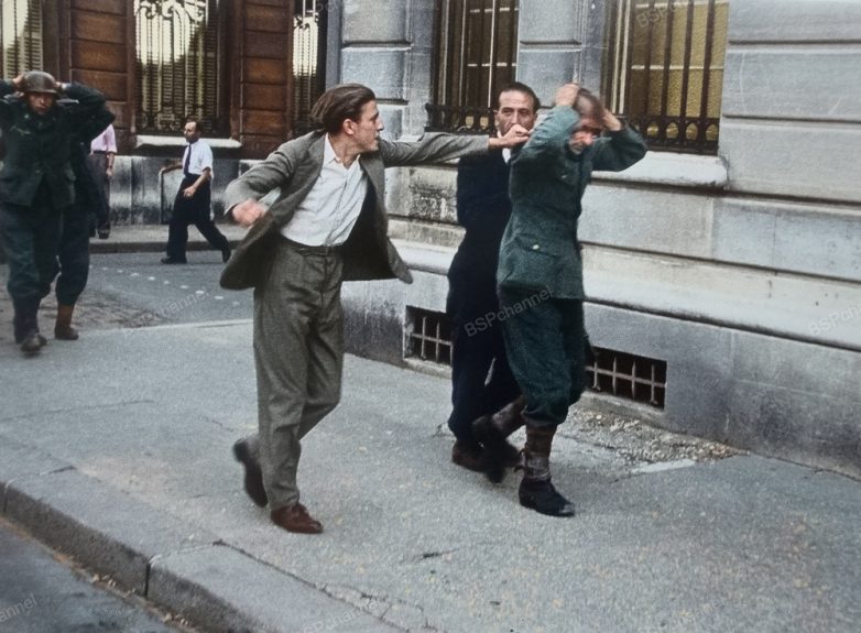 Француз замахивается кулаком на сдавшегося в плен немецкого солдата на улице Парижа, 1944 год.