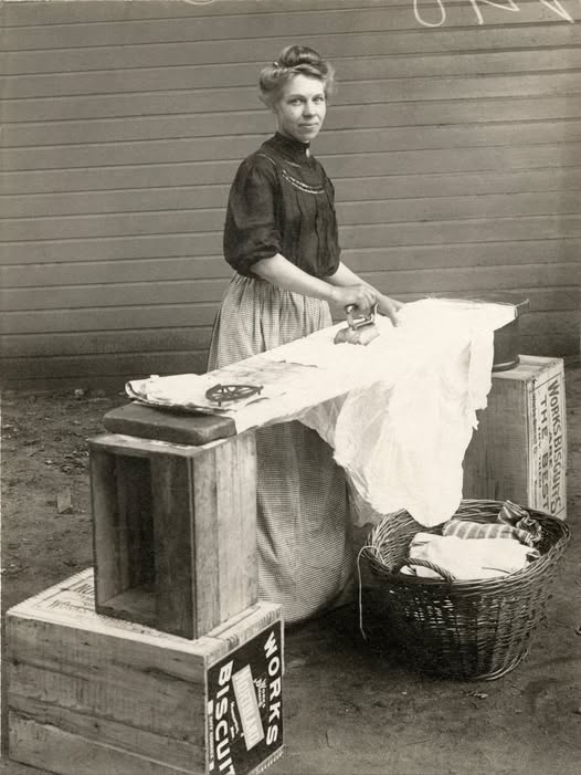 Женщина гладит свежевыстиранную одежду в Миннеаполисе, штат Миннесота, около 1910 года. Стирка тогда занимала целый день и начиналась с замачивания белья на ночь. Далее всё происходило строго по порядку: намыливание, кипячение или ошпаривание ткани, тщательное полоскание, отжим, при необходимости окрашивание, крахмаливание - и только после всех этих этапов, спустя долгие часы подготовки, наступал финальный процесс - глажка.