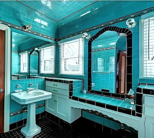 Ванная в стиле ар-деко в Лос-Анджелесе 1930-х годов: в моде были цветные плитки - мягкие голубые оттенки с тонкими чёрными линиями, подчёркивающими геометрию форм