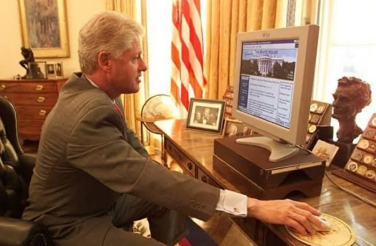 Президент Клинтон получает новый компьютер в Овальном кабинете и открывает сайт Белого дома, 2000 год