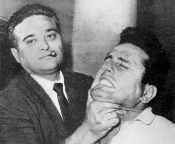Капитан нью-йоркской полиции Альберт Сидмен помогает фотографу запечатлеть лицо подозреваемого в убийстве. 1962 год.