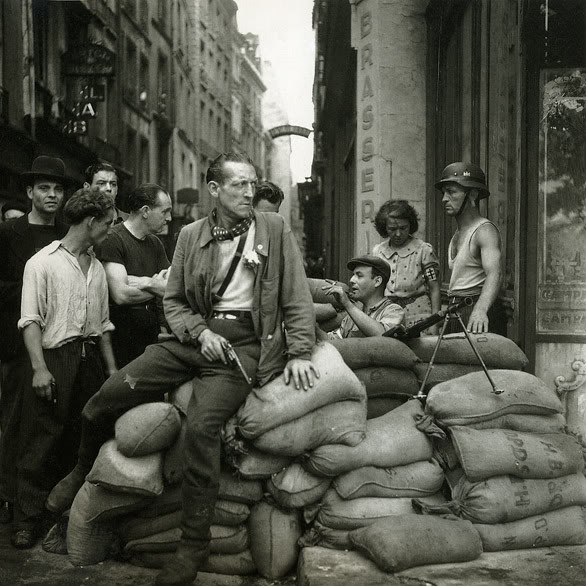 Французские бойцы Сопротивления человек на баррикаде в Париже, август 1944 год