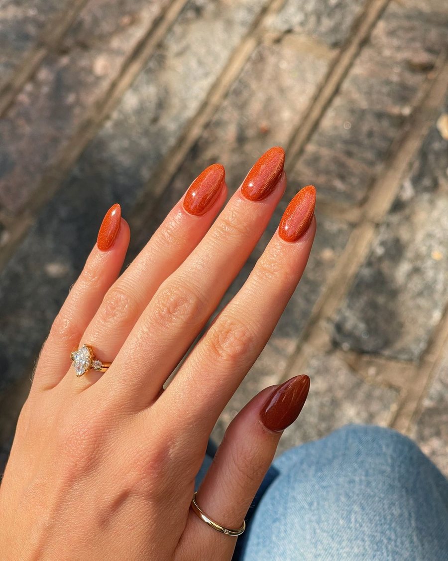 Мерцающий, как пламя свечи в сумерках. Очень эффектный вариант для маникюра с акцентом.