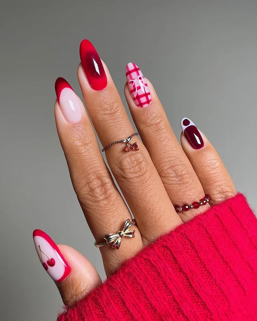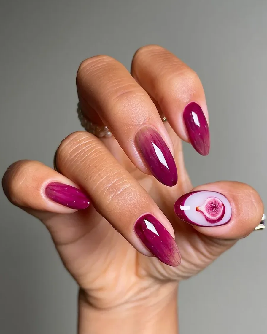 Играйте с палитрой красного: от алого до цвета «мерло». Такой френч с градиентом и мягкими аурными переходами смотрится эффектно и благородно.