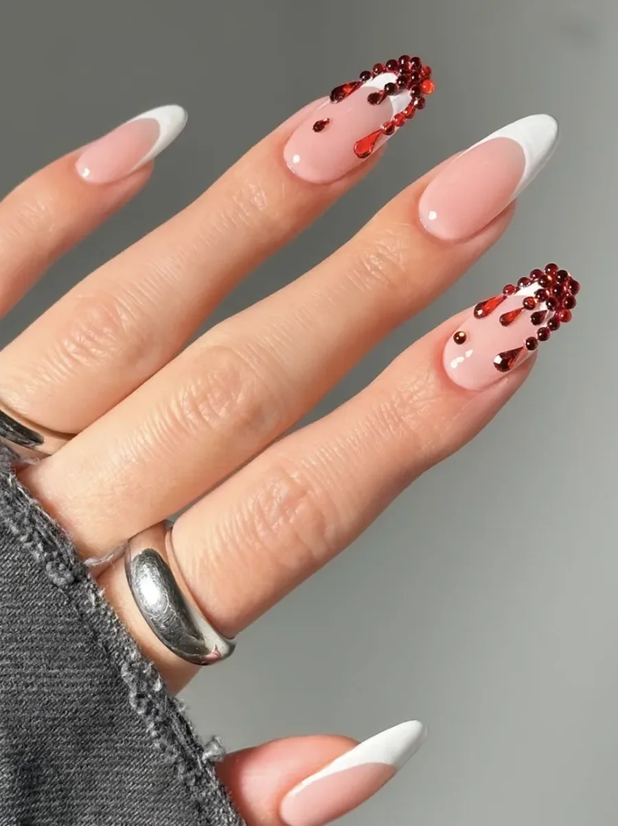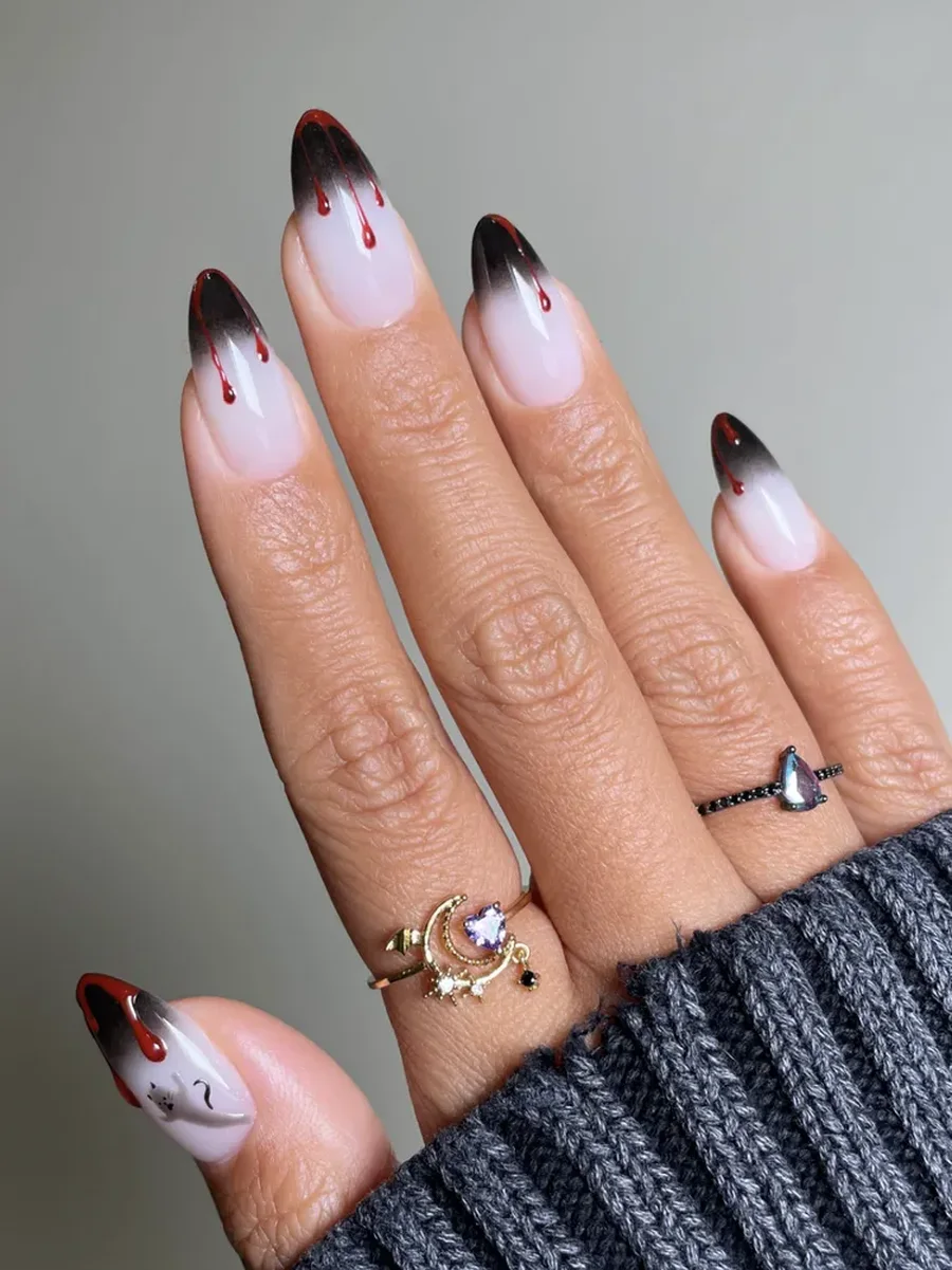 Октябрь - идеальное время добавить в образ немного мрачного гламура. Чёрно-белый омбре с каплями «крови» создаёт тонкий намёк на Хэллоуин. Используйте гель цвета густой вишни для реалистичного эффекта.