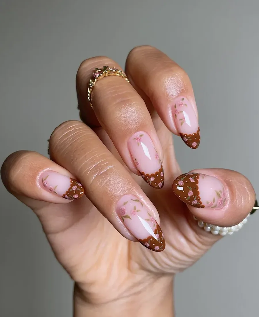 Шоколадный френч с молочной базой и нежными розовыми цветами - нежный и уютный осенний вариант.