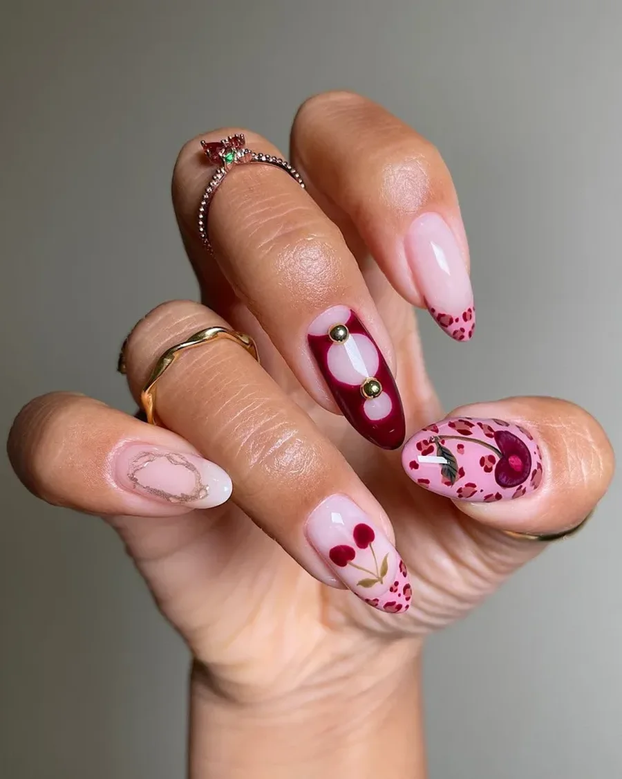 Оттенки каштана и вишни царят этой осенью. Добавьте к ним леопардовый принт и металлические акценты - получится маникюр с характером.