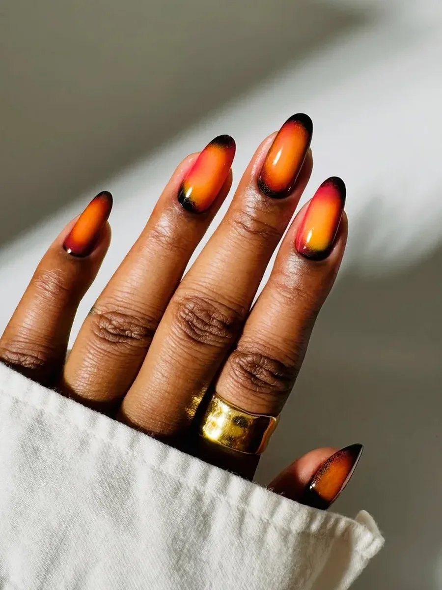 На чёрной базе яркие аурные разводы красного и оранжевого создают эффект свечения - таинственный и манящий.