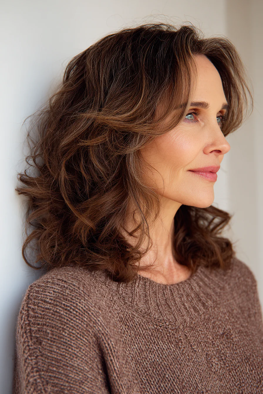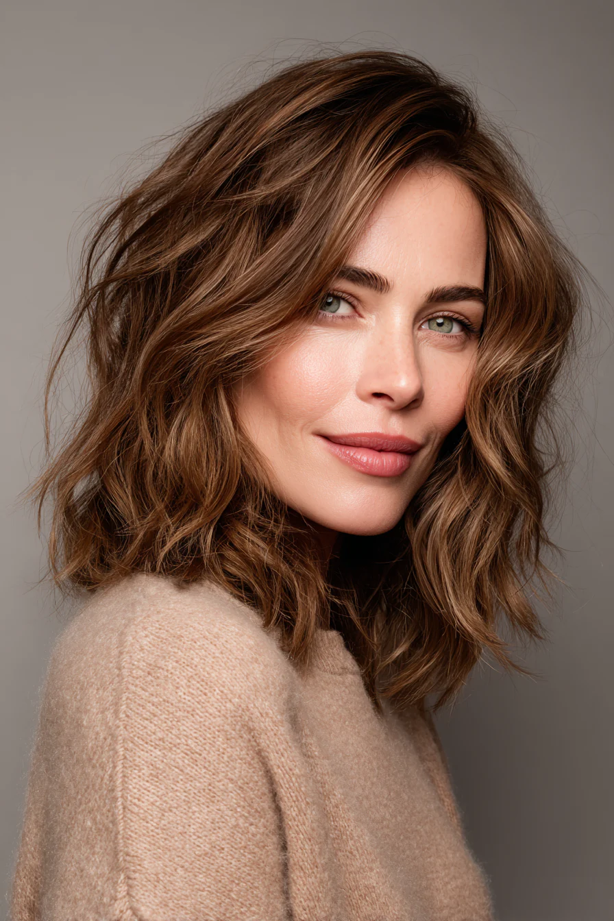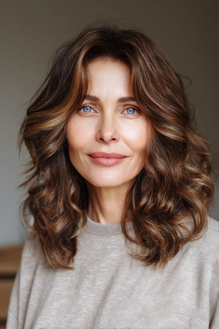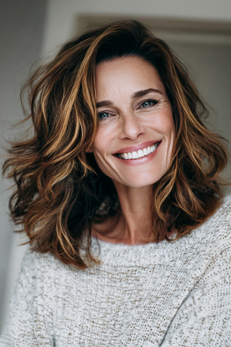 Пятидесятилетие - не время для осторожных решений. Напротив, это идеальный момент добавить текстуру, оттенок и новую форму. Волнистые волосы сами по себе создают движение, смягчают черты, помогают выглядеть естественно и собранно без усилий. Средняя длина попадает в ту самую золотую середину: хватает полотна для красивого обрамления лица, при этом укладка остаётся простой. Тенденции 2025 года про естественную текстуру, оттенки, которые освежают, и стрижки, что сотрудничают с волной, а не спорят с ней. От воздушных слоёв до пляжного шэга и глянцевого боба, эти идеи доказывают: шик не имеет возраста.