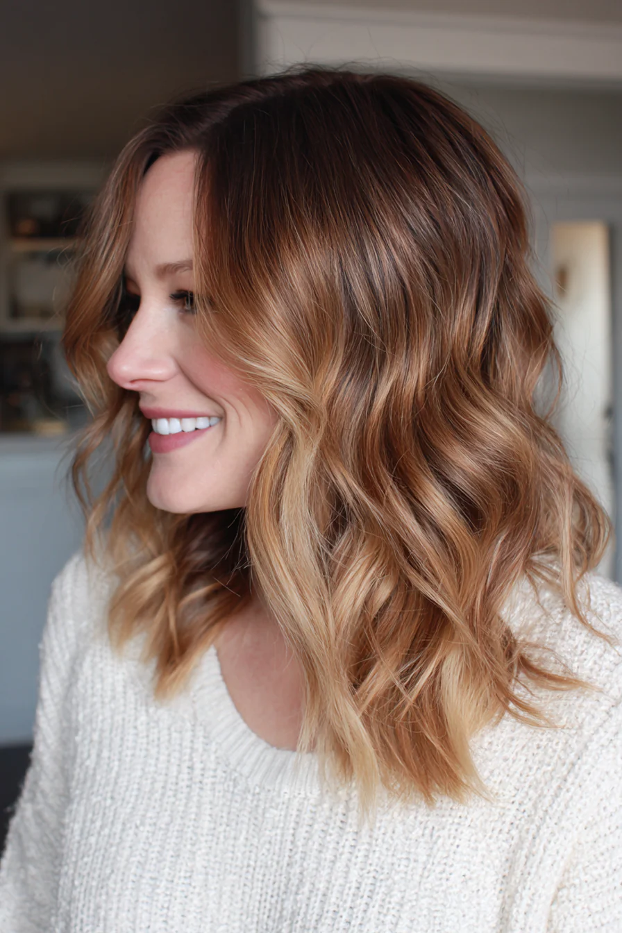 11. Волны до плеч с рыжевато‑каштановыми акцентами