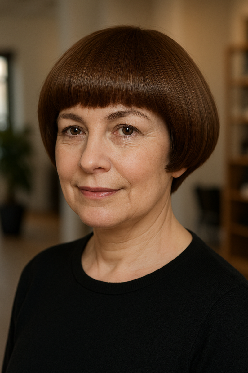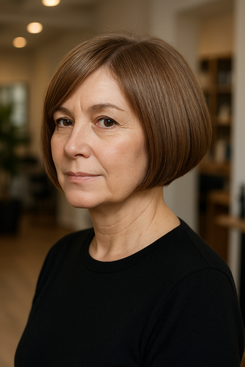 Боб держится за счёт градуировки в зоне затылка и большей длины по бокам. Силуэт получается собранным, линия шеи выглядит аккуратно. Стрижка универсальна, но любит укладку: фен и щётка придадут гладкость, лёгкий текстурный крем добавит объёма у корней. Подходит для прямых и умеренно волнистых волос, хорошо сочетается с классическим гардеробом и минималистичными украшениями.