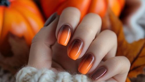 Хэллоуин все чаще переплетается с осенней эстетикой. Теплые оттенки тыквы, меди, бронзы и золота создают атмосферу уюта и праздника. Добавьте к ним золотые листья, мини-тыквы или блестки - и дизайн станет универсальным для всего октября.