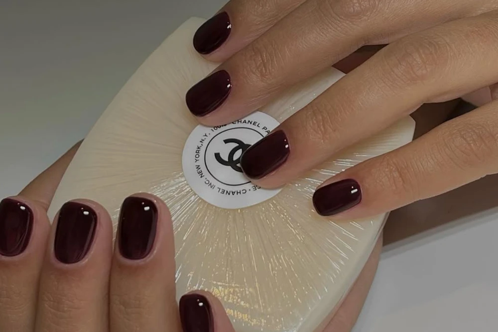 Этот тренд идеально ложится на тех, кто обожает тёмный маникюр, но хочет чего-то по-настоящему изысканного для холодного сезона. Короткие ногти здесь в фаворе - они подчёркивают интенсивность цвета и выглядят дерзко. Рекомендую подпилить их в мягкую квадратную форму с округлыми краями: так образ становится ещё смелее, почти провокационным.