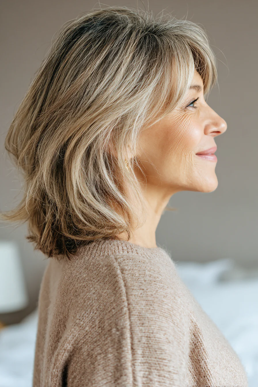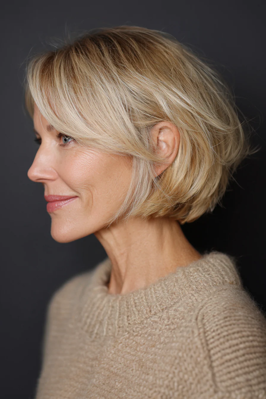 Легкое каре с мягкой градуировкой и почти невесомой челкой, которая едва касается бровей. Оттенок шампань блонд подсвечивает лицо и визуально смягчает мимические морщинки. Такой вариант хорош, если хочется выглядеть отдохнувшей без сложной укладки.