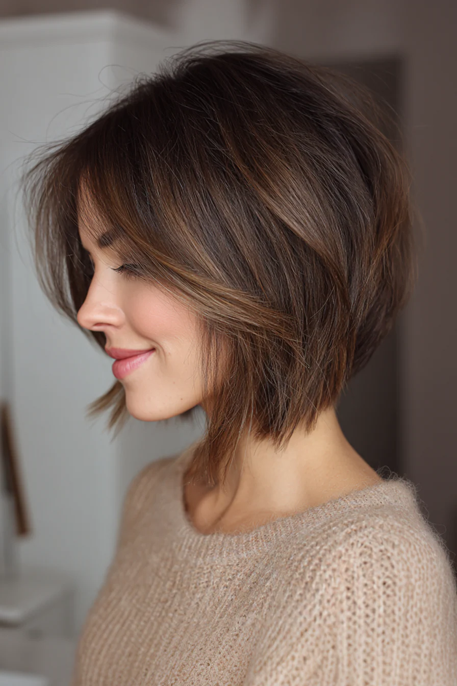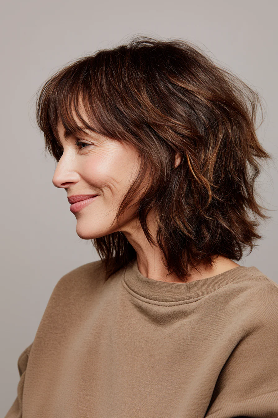 10. Небрежный плечевой срез с текстурной чёлкой в тёплом каштане