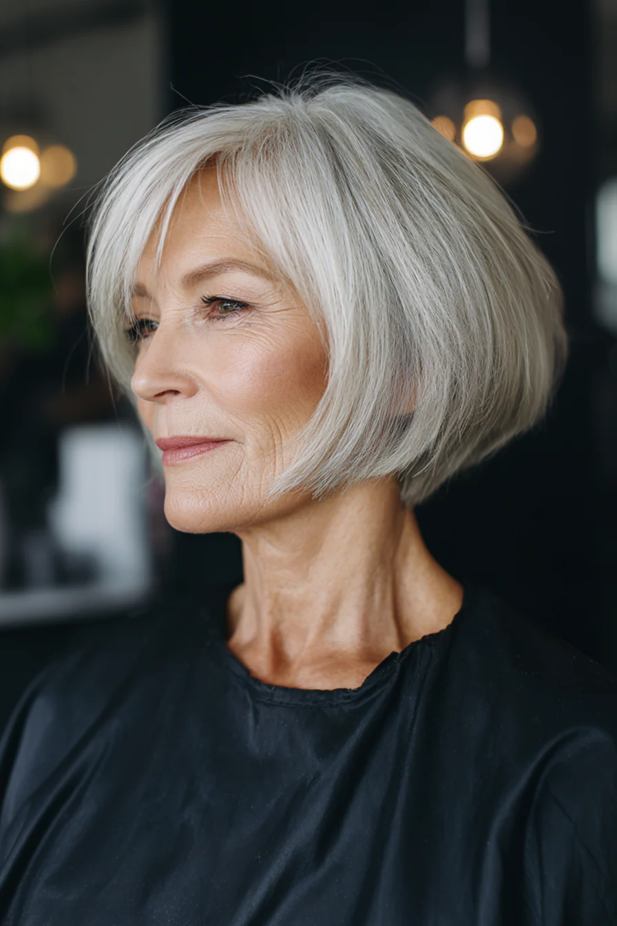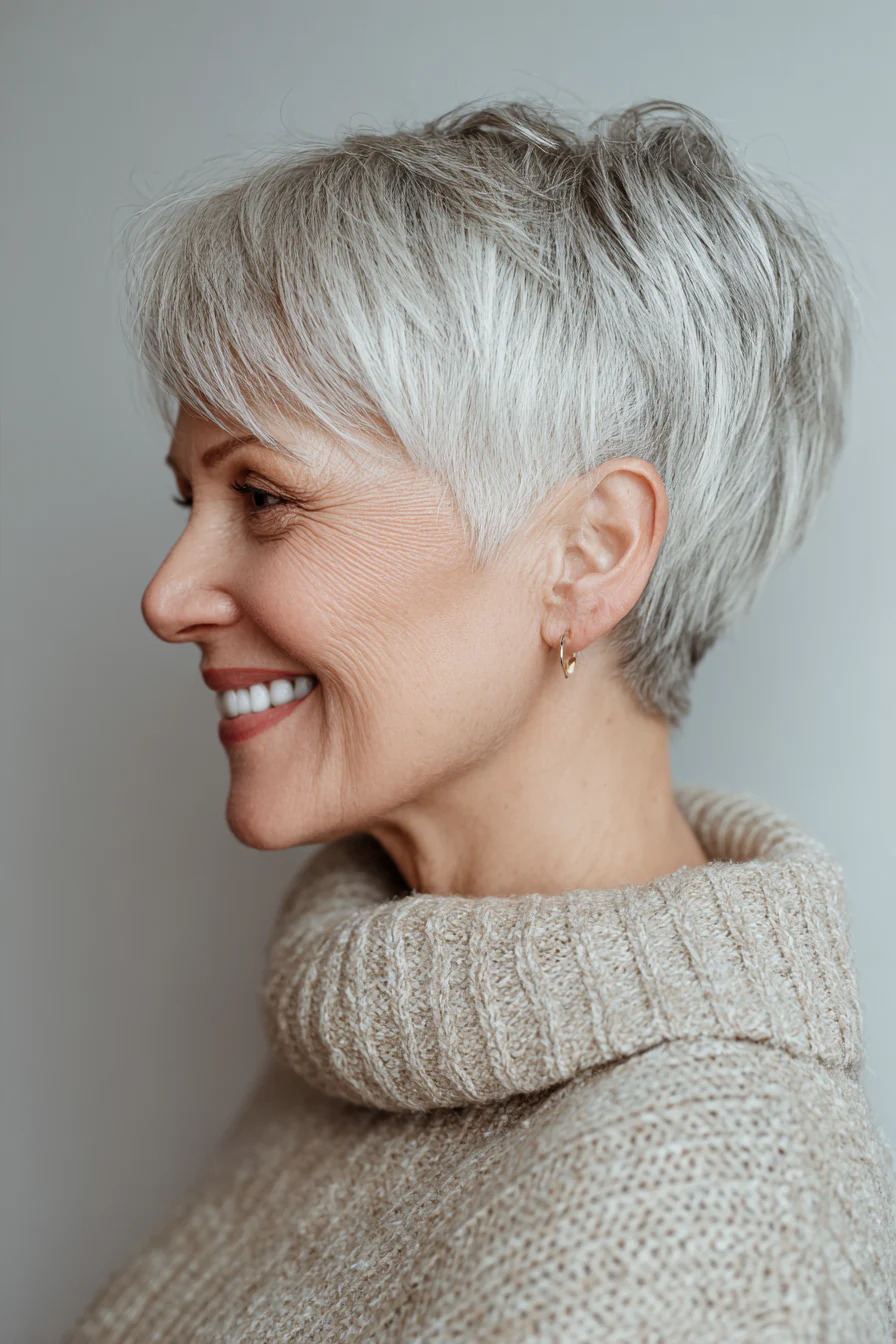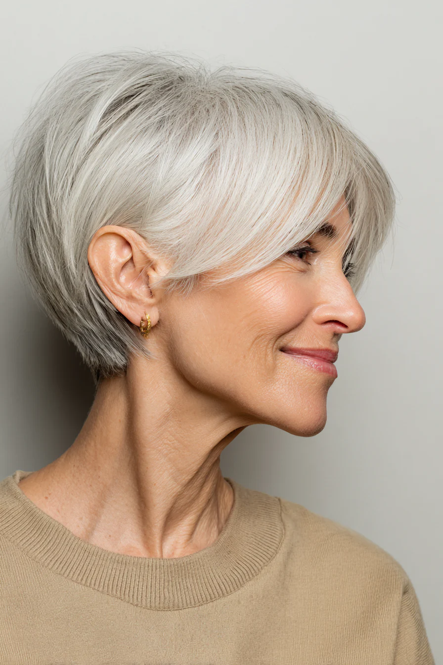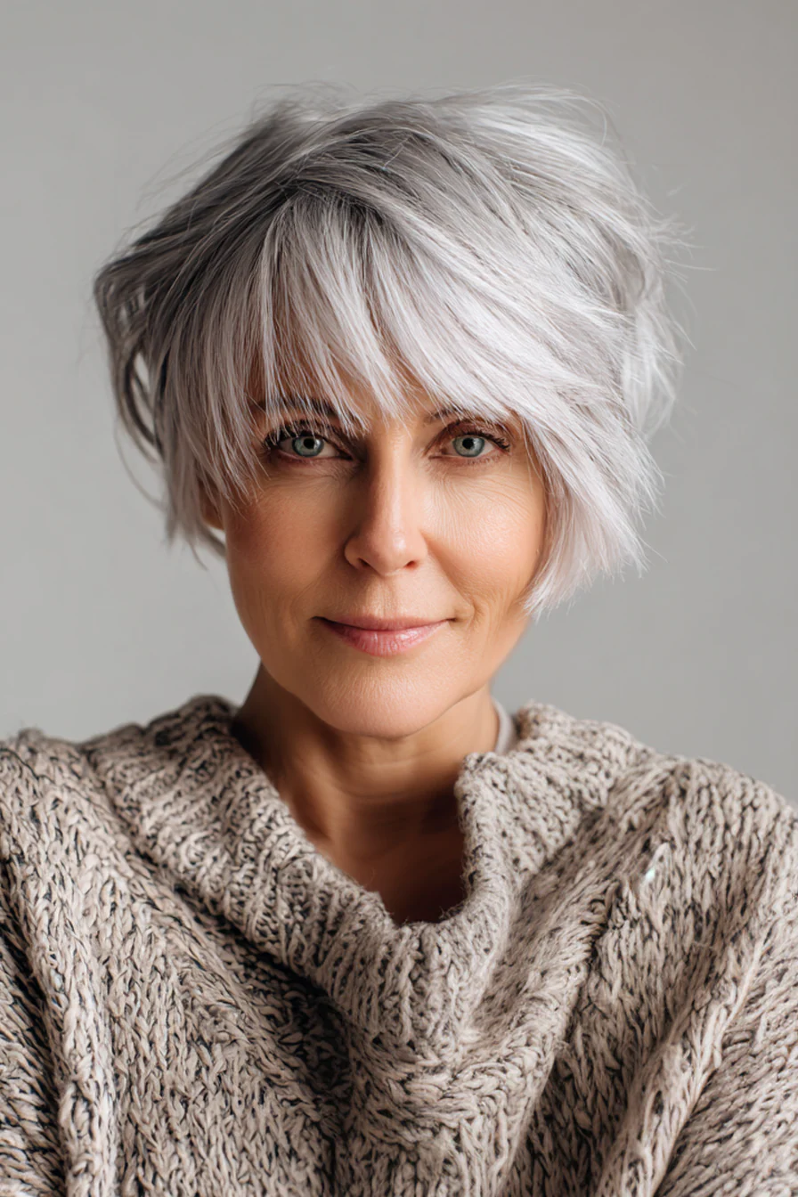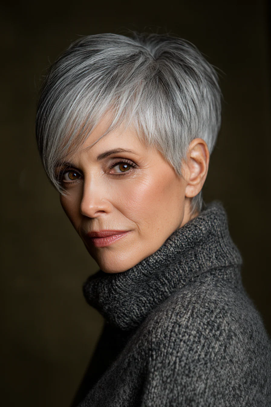 Короткое пикси облегчает повседневный уход, а удлиненная косая челка в холодном серебристом оттенке делает образ благородным. Это отличный способ подчеркнуть природную седину и превратить ее в стильный акцент.