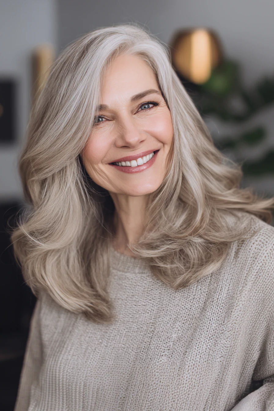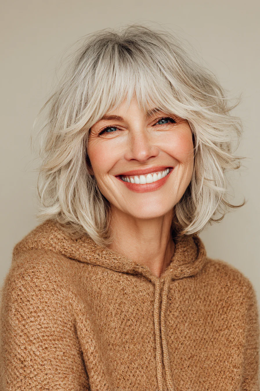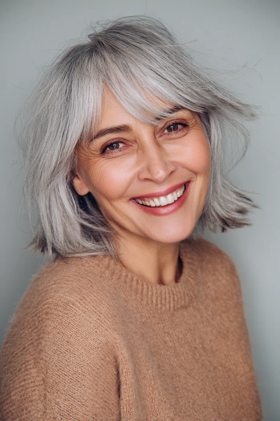 Тот случай, когда объем и небрежность выглядят продуманно. Текстурная челка и многослойные пряди создают модный «рассыпчатый» силуэт. Дымчато-серая гамма помогает красиво носить седину и при этом оставаться в тренде.