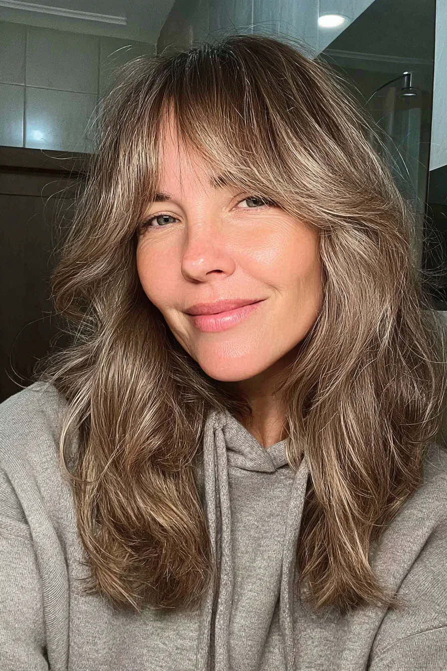 23. Небрежный лоб с длинными челками-шторками в песочном шатене