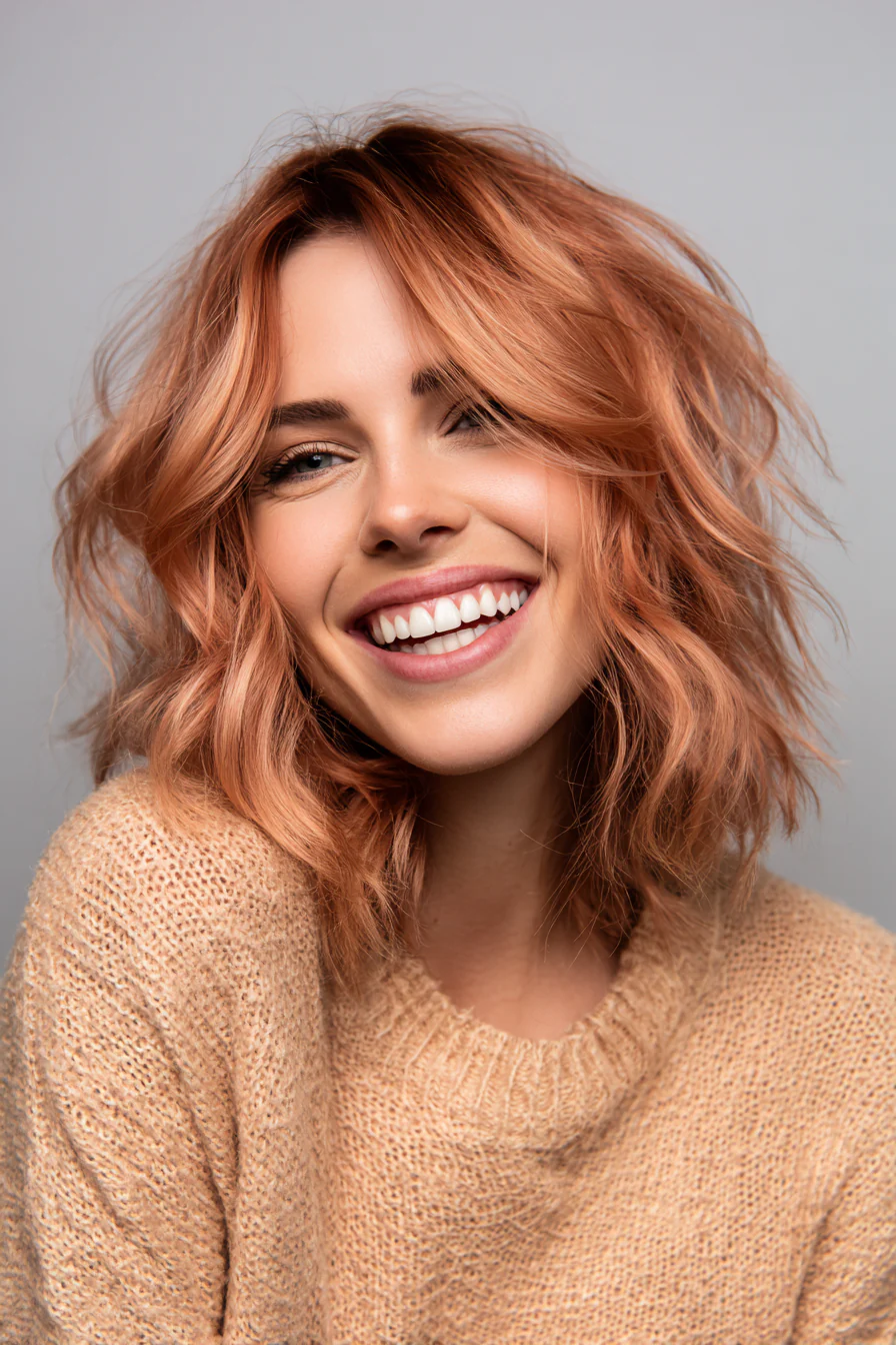 9. Волнистый лоб с челкой-шторками в розовом золоте