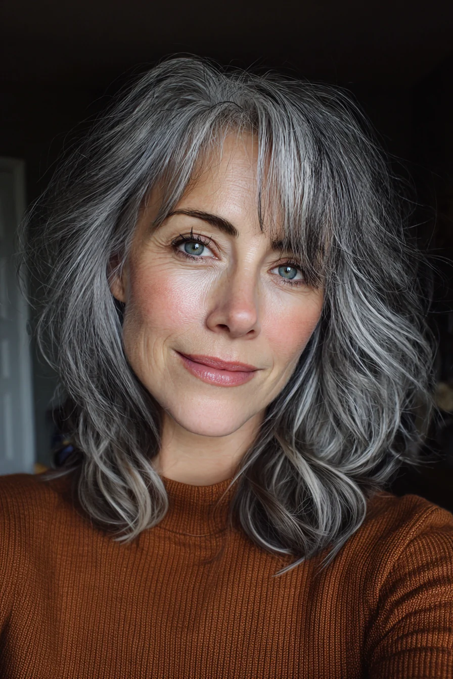 Серебристый шегги с перьевидными концами подчеркивает благородную седину и делает образ очень современным. Легкие «перья» по периметру смягчают линию лица, снимают тяжесть и визуально вытягивают овал. Такая стрижка хорошо работает на прямых и слегка волнистых волосах, особенно если важно убрать излишнюю плотность по краям. Серебристый оттенок смотрится стильно, а не «старомодно», когда форма стрижки актуальная и живописная.