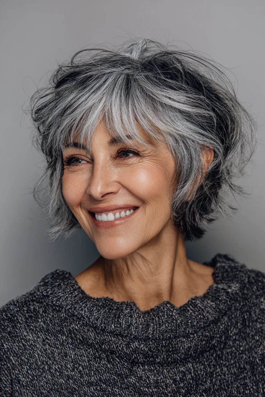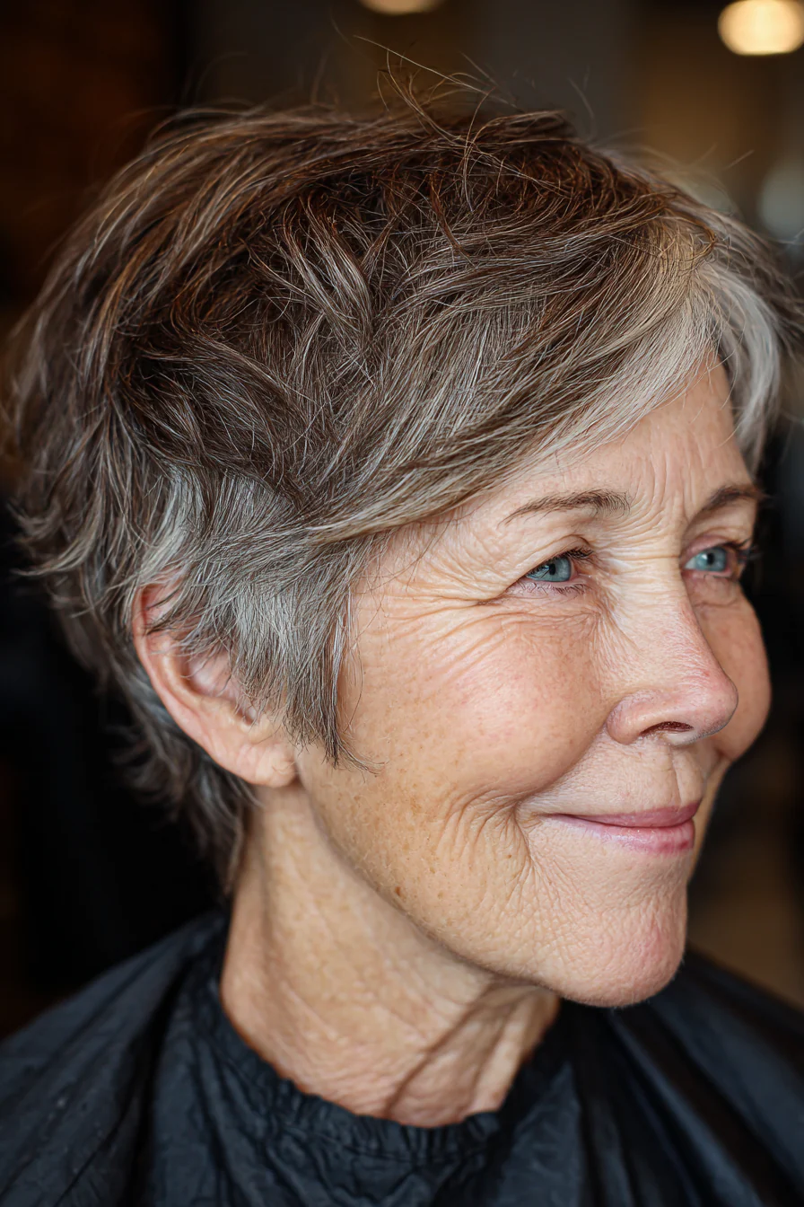 Соль и перец в короткой стрижке шегги выглядит стильно и честно, без попыток спрятать возраст. Слои по всей голове поднимают волосы у корней и убирают излишнюю плотность по краям. Такой вариант прекрасно подчеркивает естественный микс седых и тёмных волос, превращая его в достоинство. Уход минимальный, достаточно слегка подсушить волосы руками и придать форму.