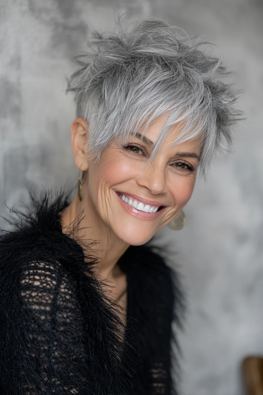 Короткий шегги-пикси на мягком сером оттенке показывает, что седина может быть очень стильной. Перьевые слои по краю стрижки создают аккуратный, но живой контур, а объем в зоне макушки визуально вытягивает силуэт. Такой вариант хорош для тех, кто устал от постоянного окрашивания и готов перейти на благородный серый.