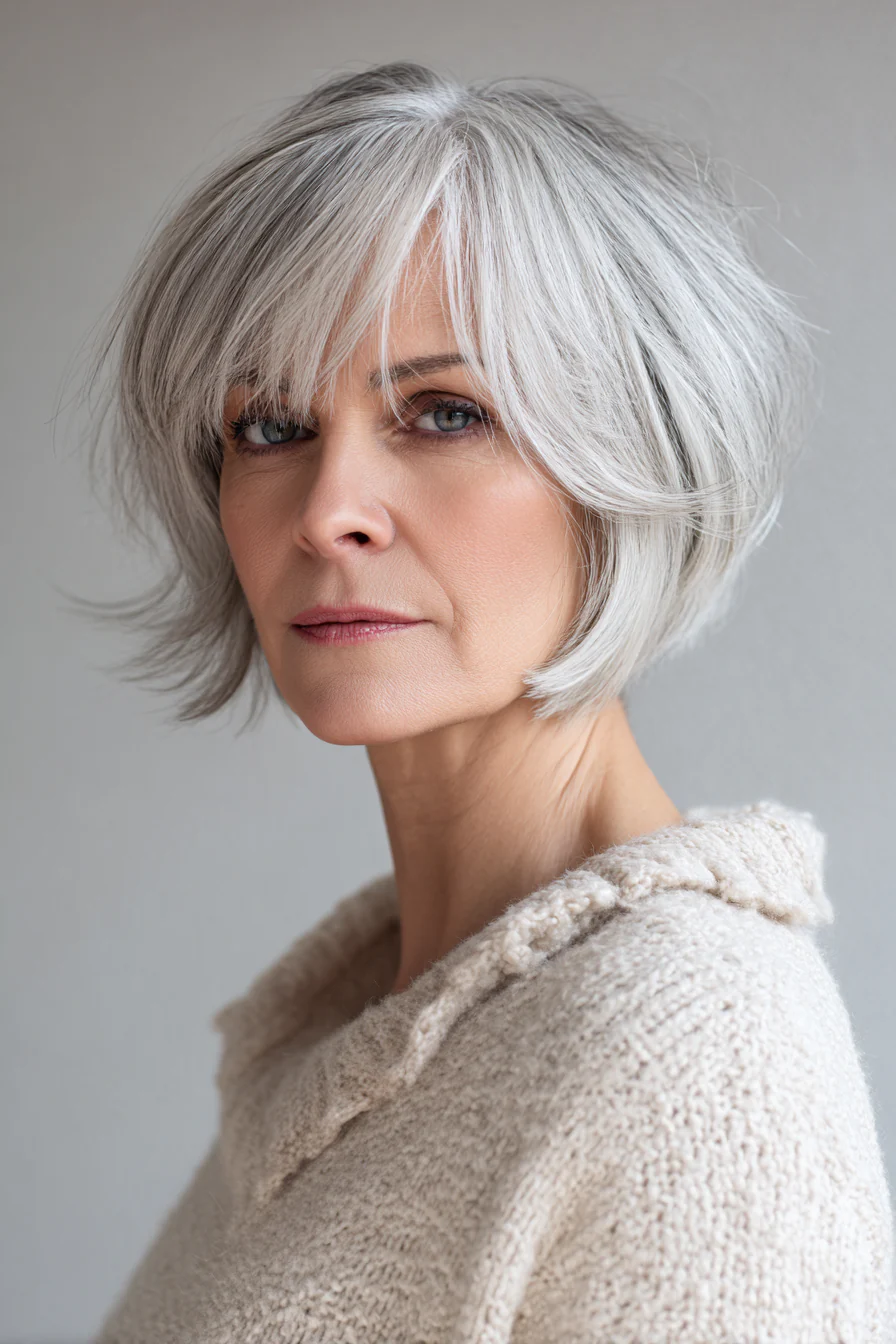 Легкий градуированный боб до линии подбородка с невесомыми слоями и мягкой челкой-шторкой, плавно переходящей в пряди у лица. Холодный серебристый оттенок красиво подчеркивает натуральную седину и добавляет прическе подсвеченный, благородный эффект, без ощущения «серых» волос.