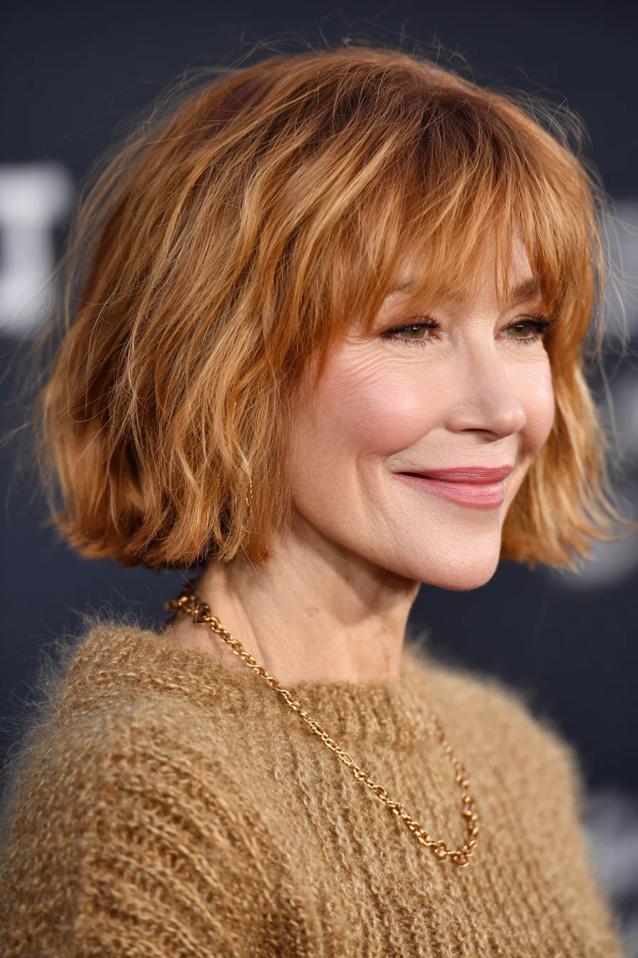Боб до линии челюсти с легкой градуировкой и короткой перьевой челкой, которая едва касается лба. Теплый медно-рыжий оттенок придает лицу свежесть и делает образ живым даже в пасмурную погоду. Вариант для смелых, но элегантных перемен.