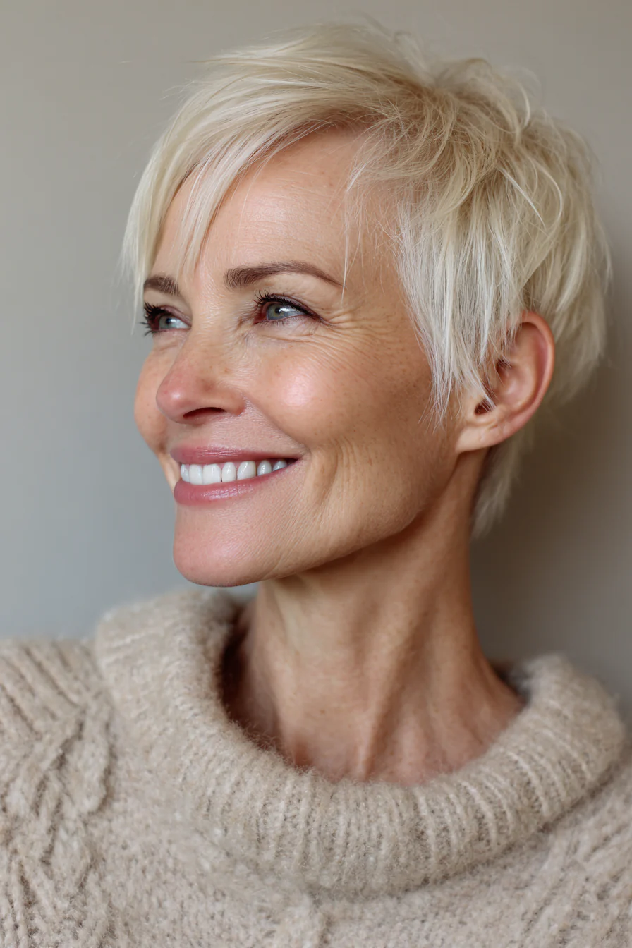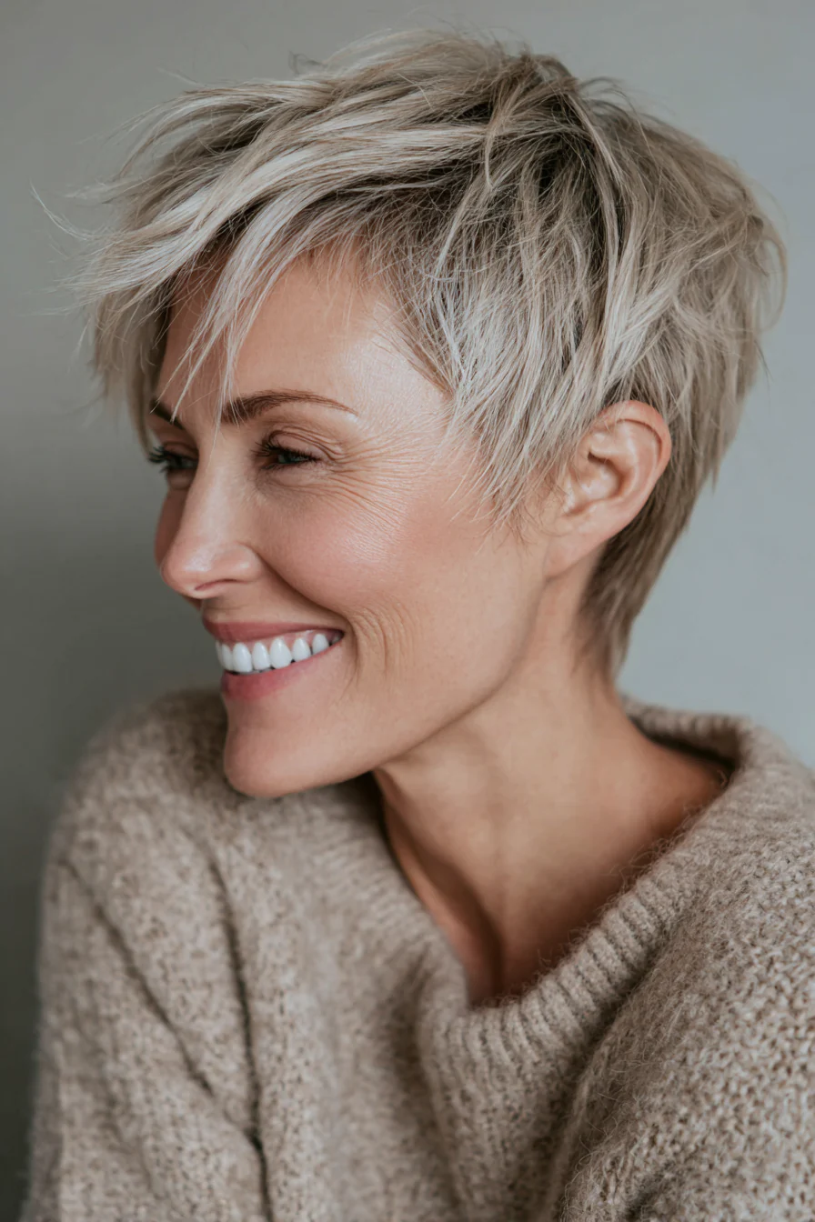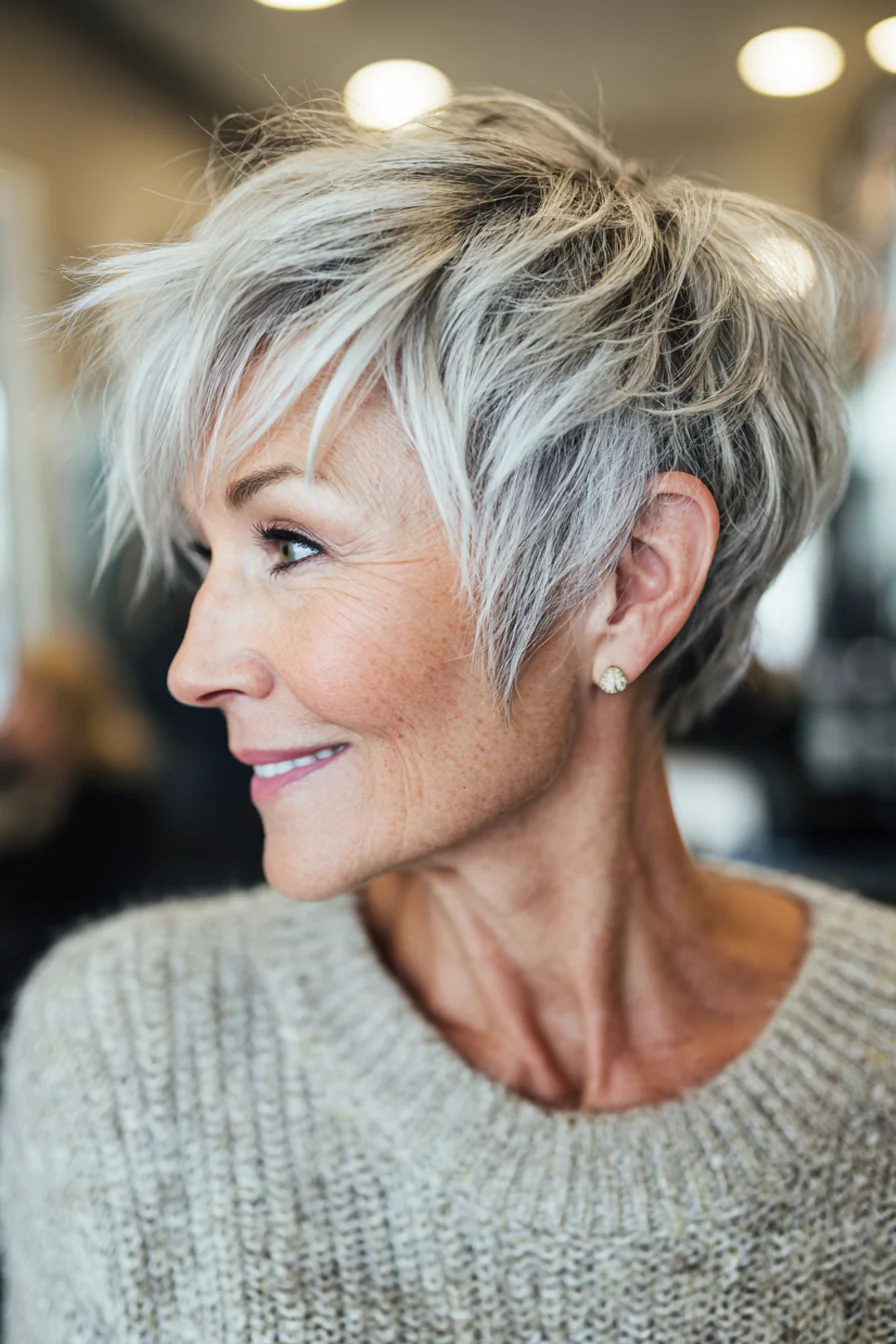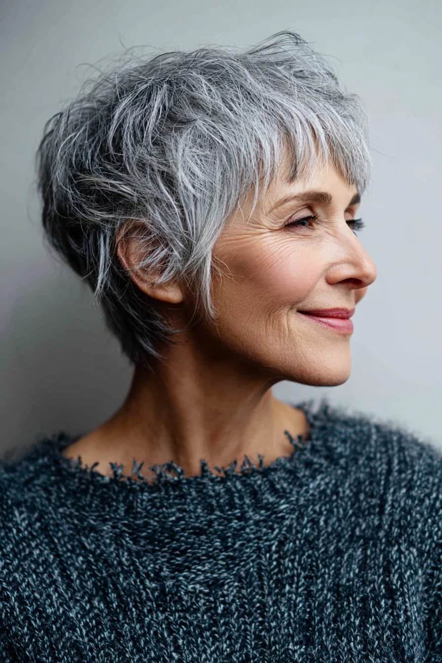 Гибрид короткой стрижки пикси и шэг, с мягко прореженными слоями и текстурной челкой, которая создает ощущение объемной, но легкой верхней части. Серо-блондинистый тон освежает и делает стрижку более современной, хорошо подчеркивая структуру волос.