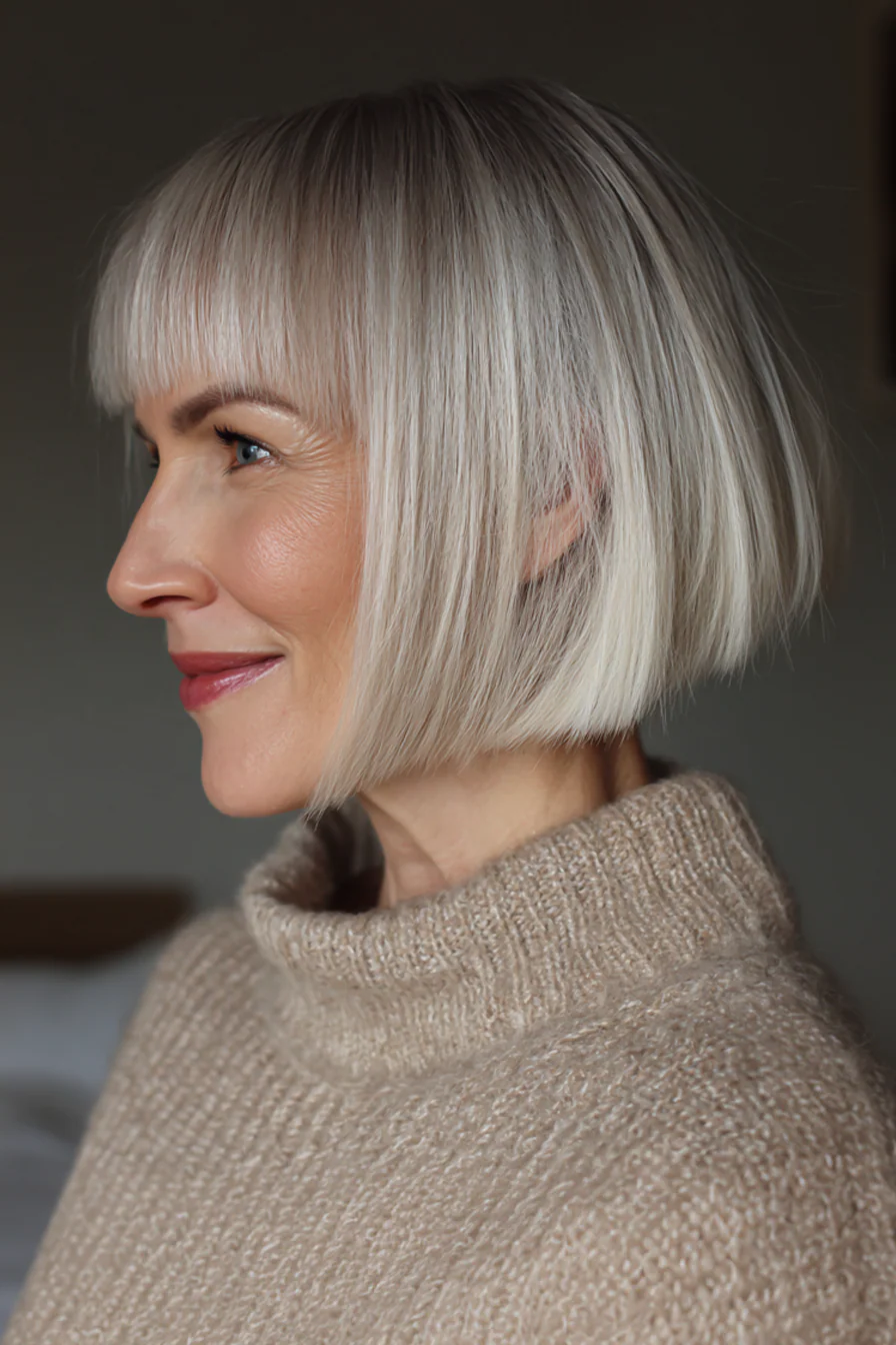Четкое каре с ровным срезом и очень короткой, графичной челкой, которая открывает лоб и делает акцент на глазах. Холодный платиновый блонд усиливает четкость линий и создает современный, чуть авангардный образ. Стрижка для тех, кто любит минимализм и уверенные формы.