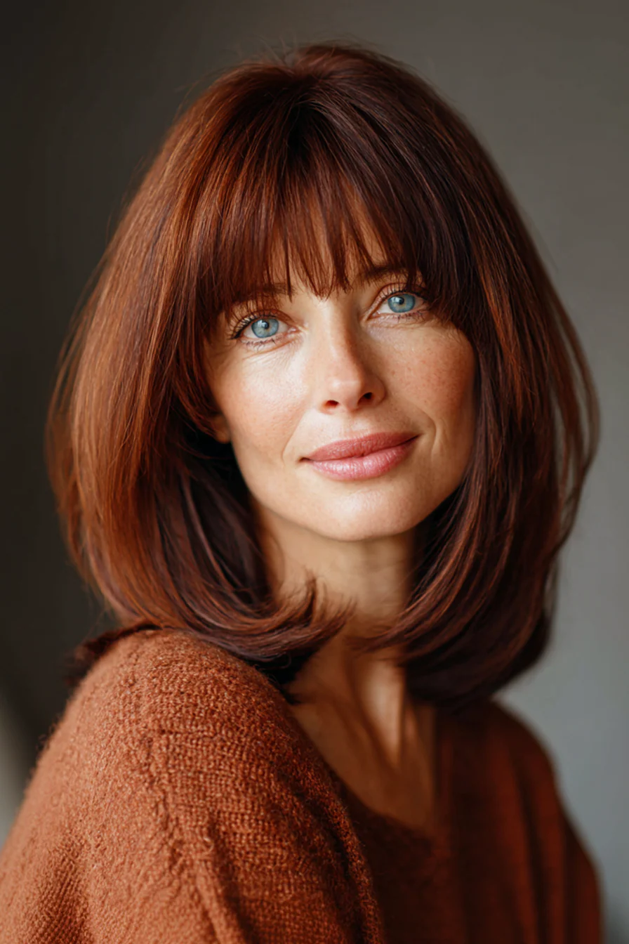 15. Стрижка до плеч в насыщенном махагоновом оттенке с мягкой полукруглой челкой