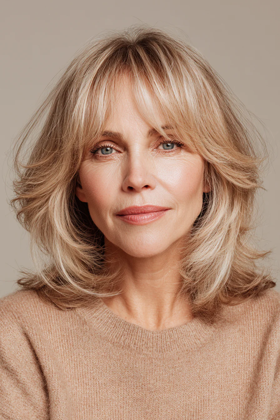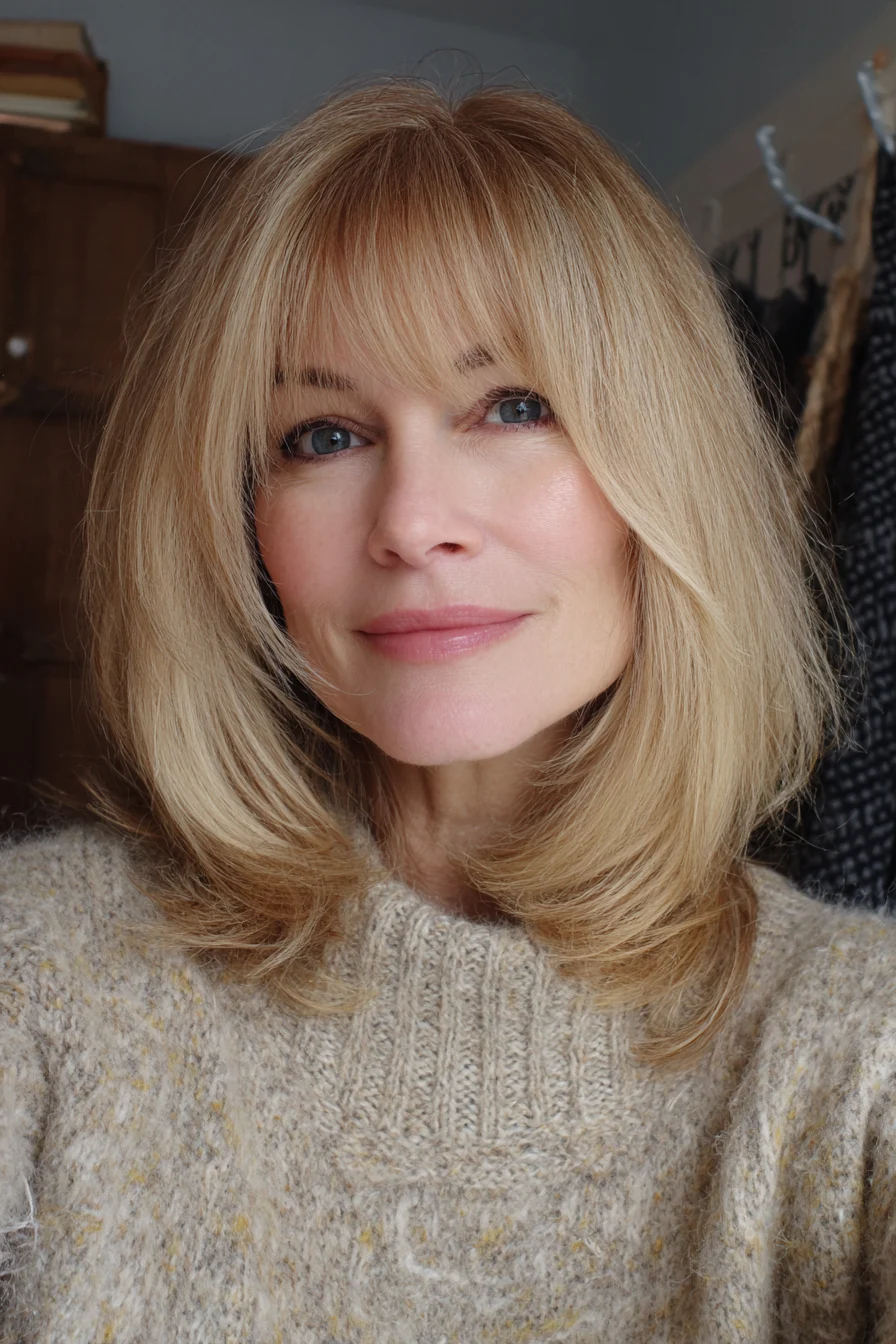 Стрижка средней длины с мягкими слоями и более плотной, объемной челкой, уложенной с легким подъемом. Медово-бежевый оттенок добавляет тепла и мягко подсвечивает кожу. Этот вариант подойдет тем, кто любит ощущение «полной» прически и визуальный объем в зоне лба.