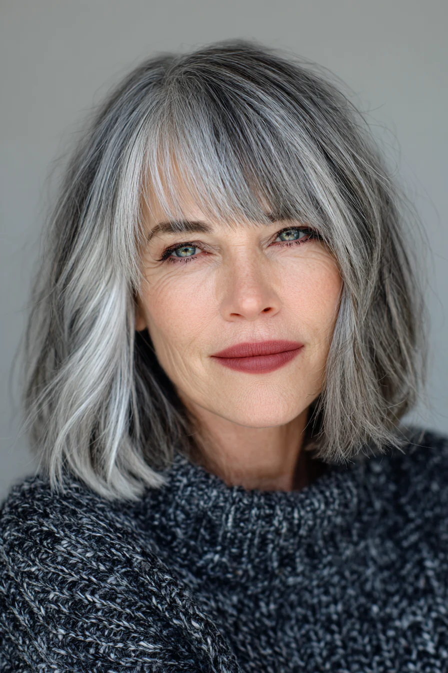 Лонг-боб до ключиц с челкой, которая постепенно заужается к вискам и плавно переходит в основную длину. Дымчато-серый цвет придает волосам глубину и помогает органично вписать седину в общий образ. Стрижка выглядит аккуратно, но не слишком строгой.