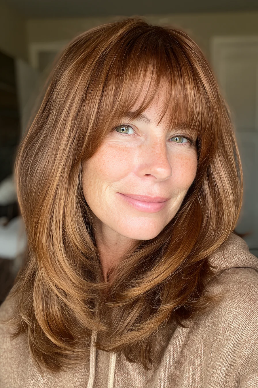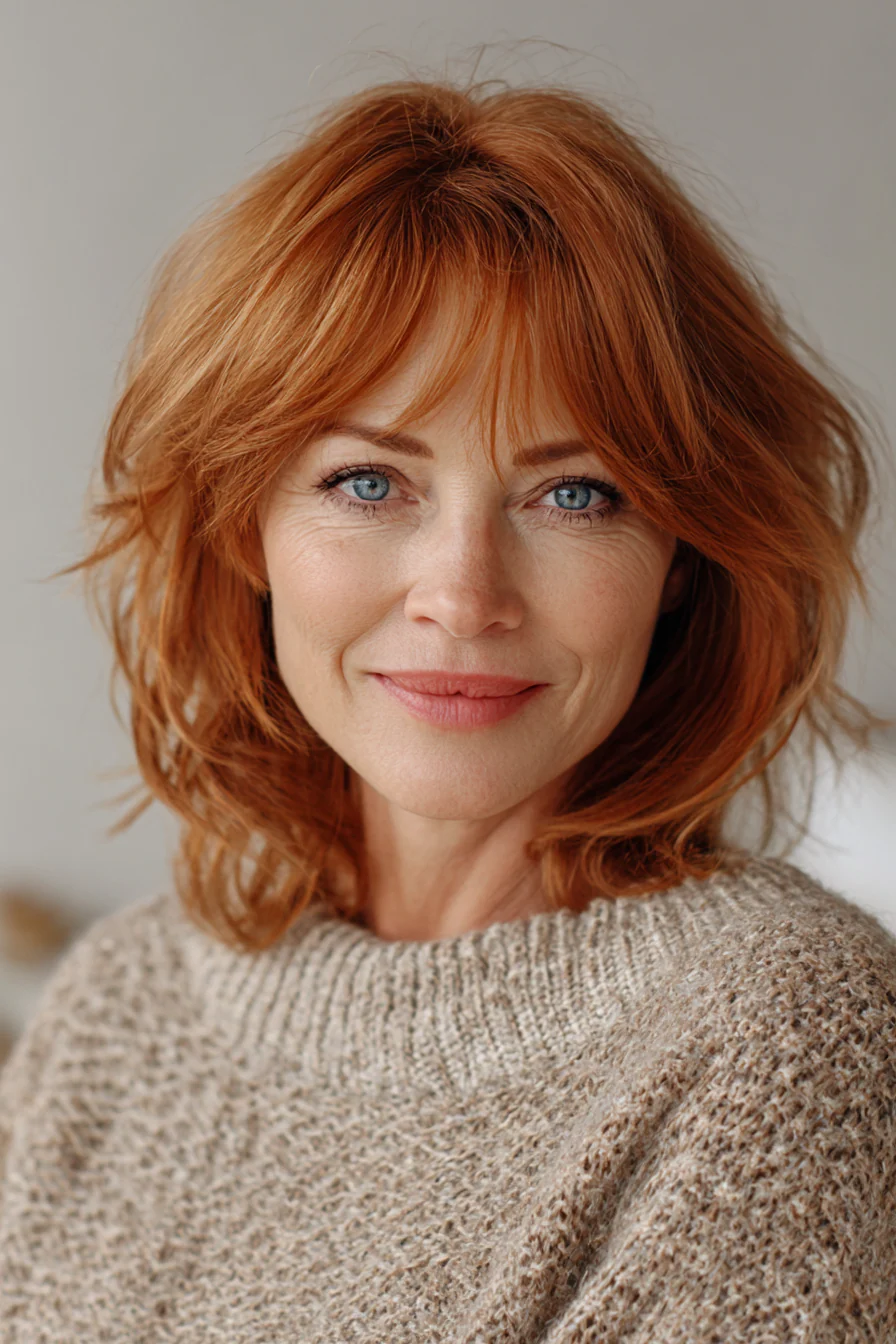 18. Мягкий рыжевато-медный шэг-лоб с перьевой челкой вокруг лица