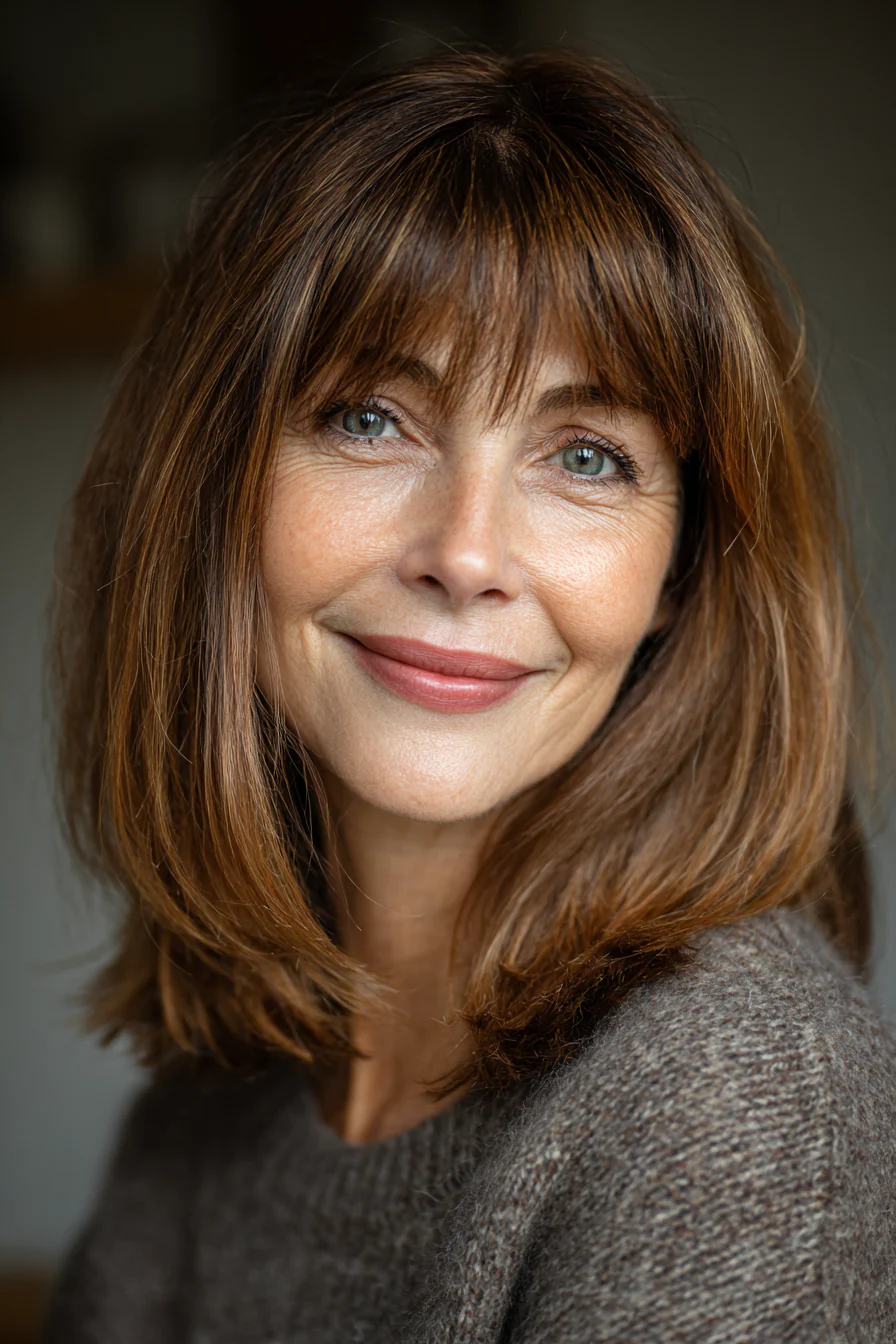 Стрижка до ключиц с плавной линией среза и мягко округлой челкой, которая повторяет форму лба и слегка заходит на брови. Оттенок лесного ореха смотрится естественно и благородно, особенно на женщинах с теплым подтоном кожи. Такая челка отлично смягчает черты и придает образу завершенность.