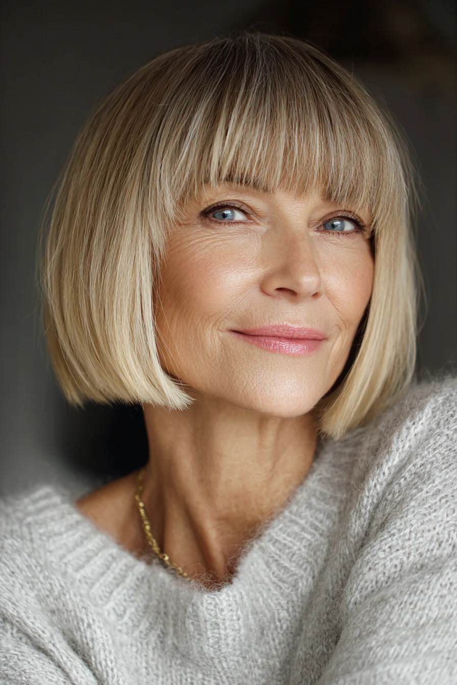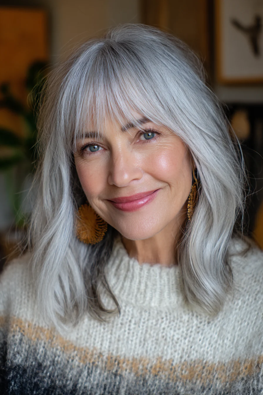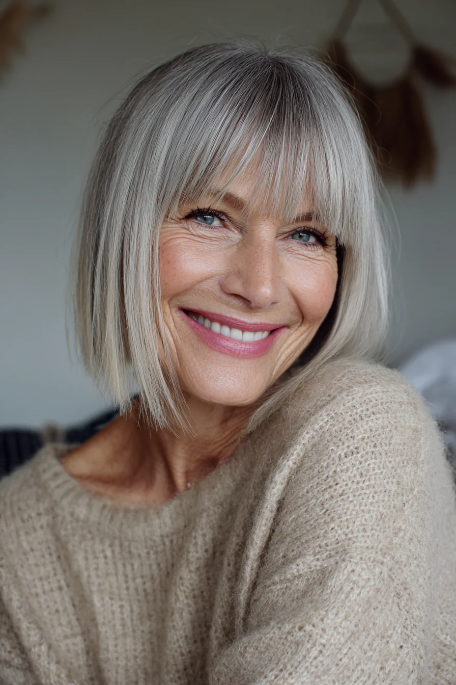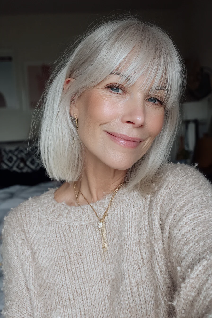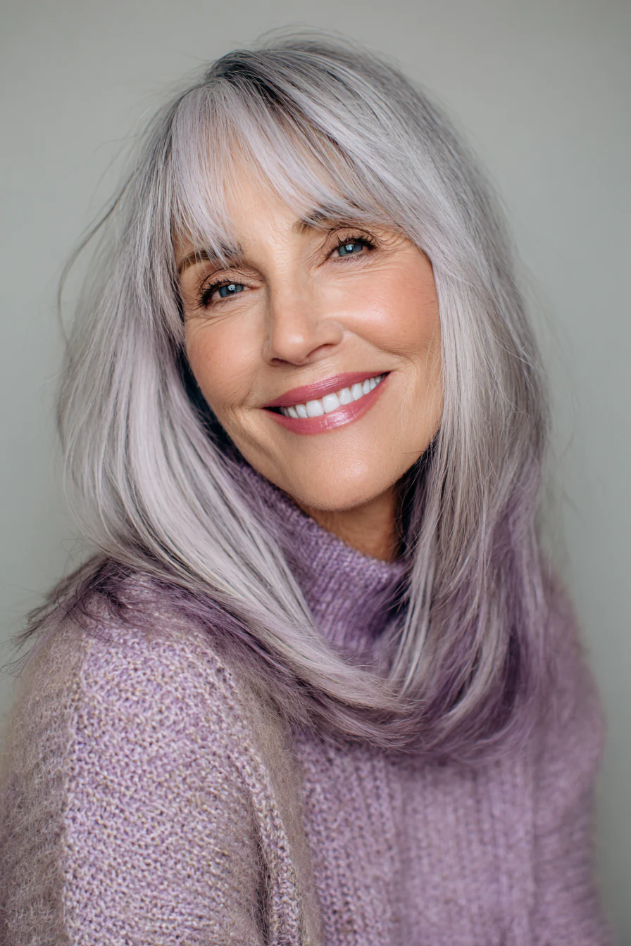 Удлиненный боб чуть ниже плеч с легкой, «дышащей» длиной по краям и тонкой, почти невесомой челкой. Едва заметный серебристо-лавандовый оттенок добавляет модный акцент, но остается деликатным и уместным для возраста 50+. Такой цвет особенно красиво смотрится на светлой седине.