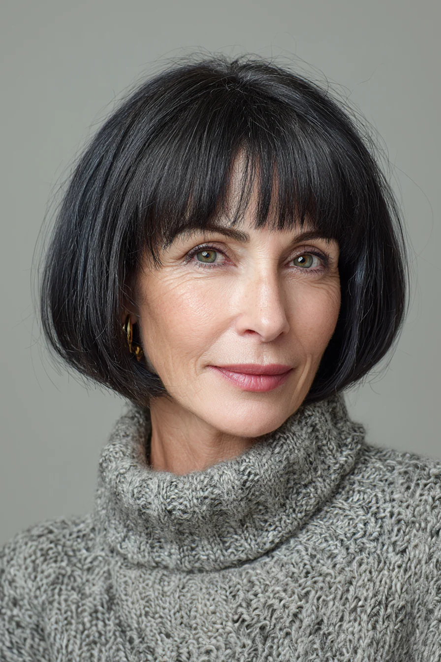 Четкий, аккуратный боб с длиной до подбородка или чуть ниже, дополненный длинной челкой, которая плавно обрамляет лицо и подчеркивает скулы. Мягкий черный оттенок усиливает блеск волос и визуально делает линию стрижки точнее. Такой вариант особенно хорош на густых или прямых волосах.