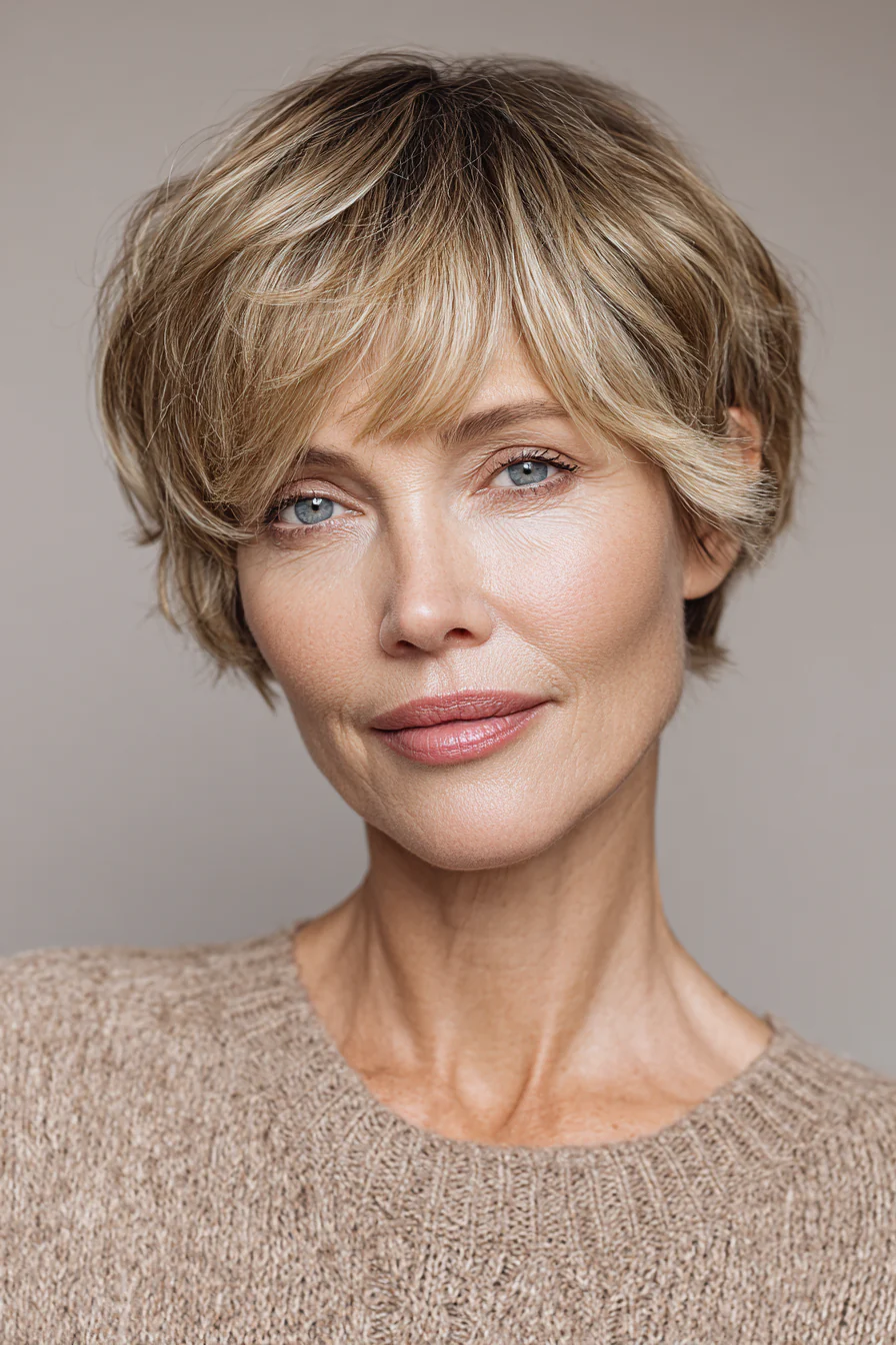 Комбинация пикси и боба: затылок короче, передняя часть немного длиннее, челка мягко профилирована и создает легкую текстуру. Теплый песочный оттенок делает прическу живой и солнечной даже без сложной укладки. Удобный и стильный вариант для женщин, которые любят короткие стрижки, но не хотят слишком «жестких» линий.