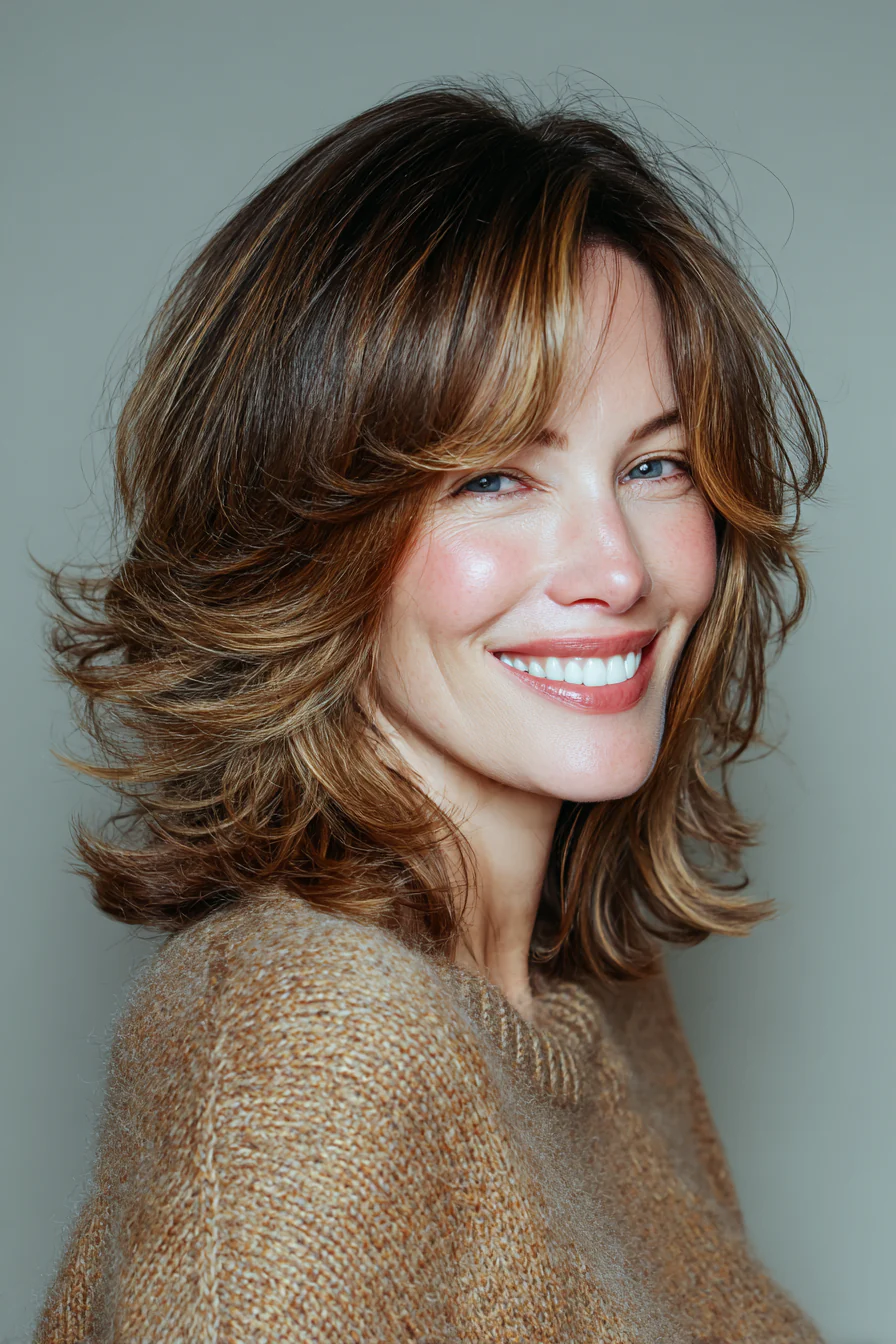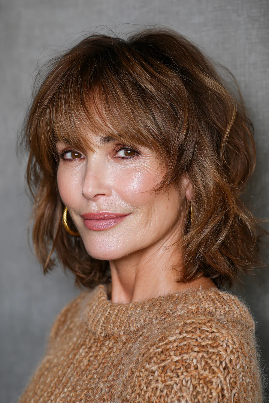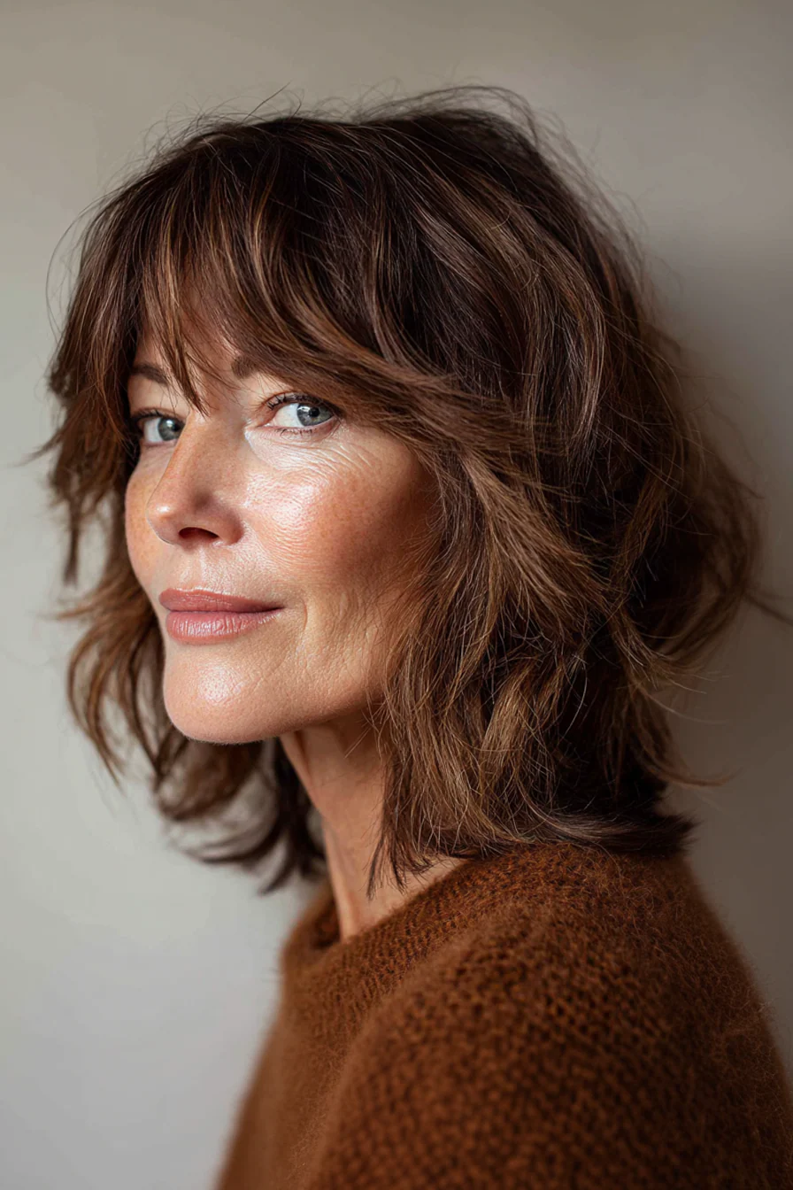 Многослойная стрижка шэг до ключиц с мягко прореженными концами и невесомой челкой, чуть касающейся бровей. Теплый каштановый оттенок делает пряди объемнее и подчеркивает текстуру. Такой вариант особенно хорош для тех, кто хочет движения и свободы в волосах без идеальной «шапки».