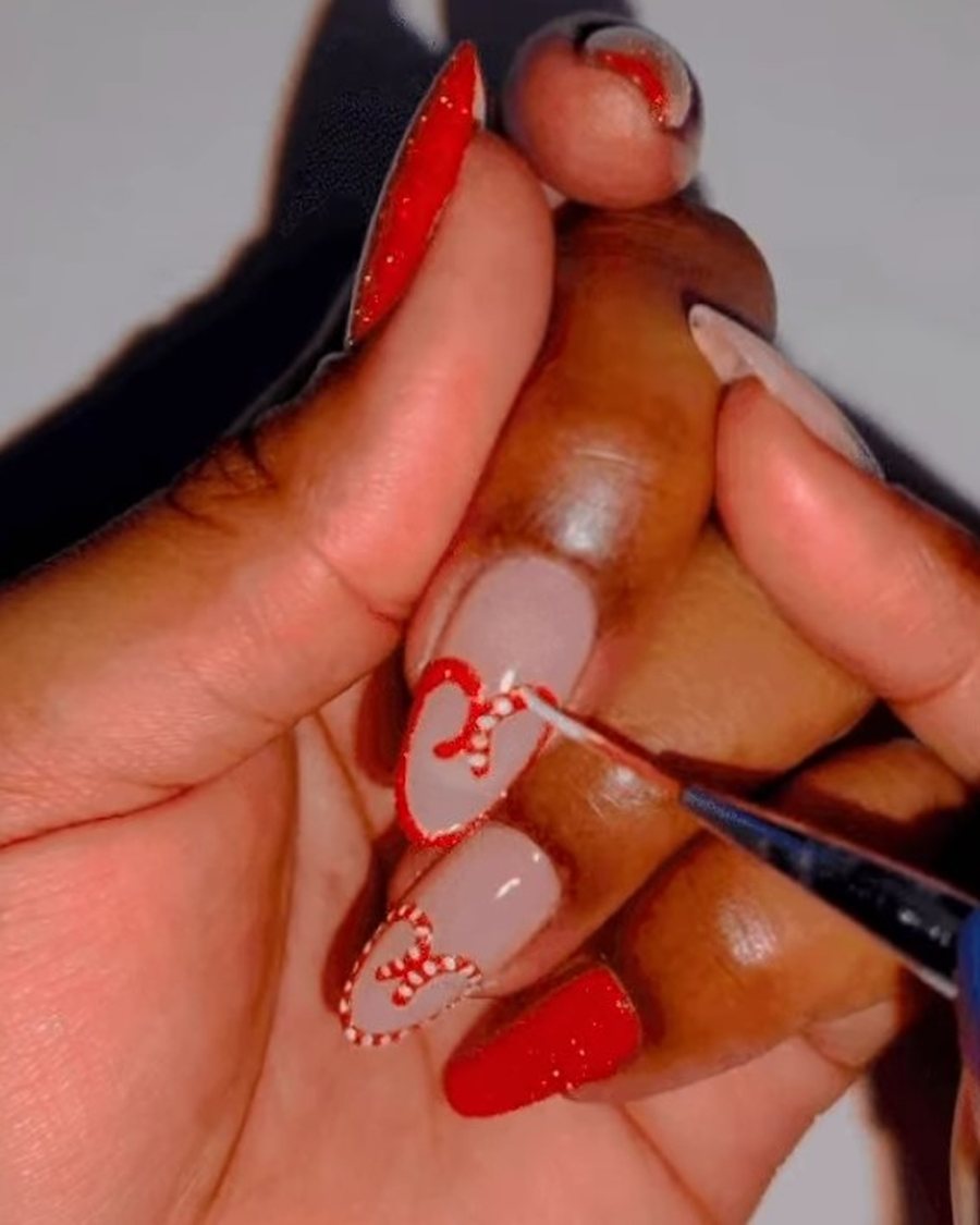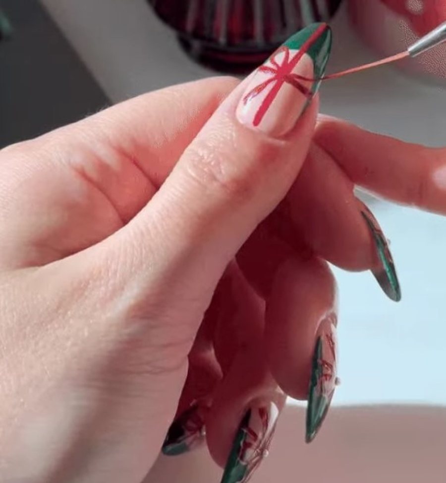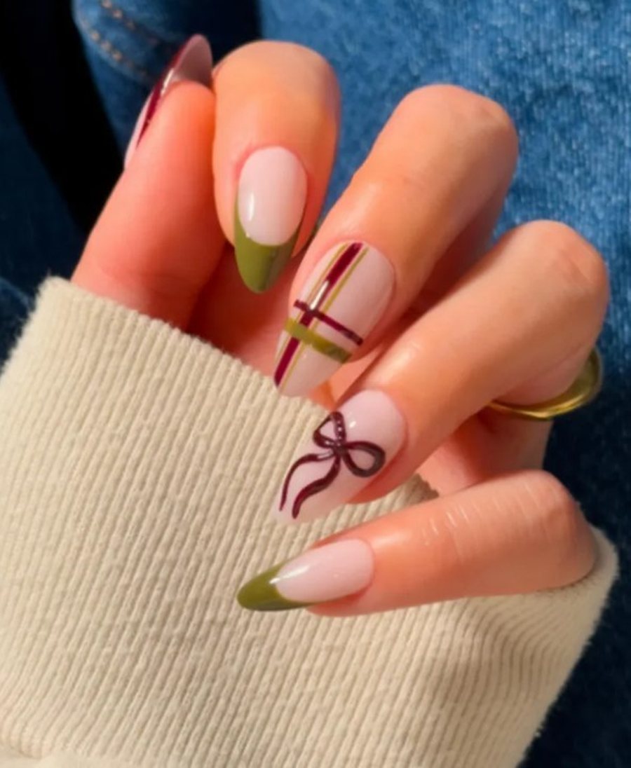 Сочетание сезонной клетки и банта создаёт элегантный маникюр. Глубокая вишня вместо классического красно-зелёного делает образ менее «рождественским».