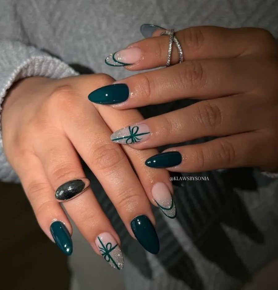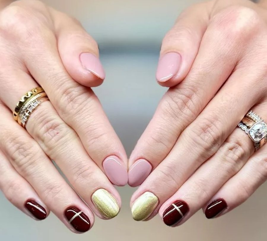 Тонкие линии золота или серебра поверх красного или зелёного френча - деликатно и очень торжественно.