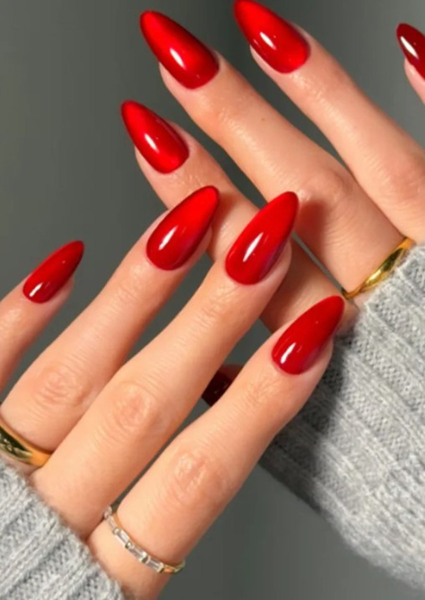 Ярко-красная основа, магнитный эффект и прозрачный красный топ - ногти выглядят как отполированный стеклянный камень.