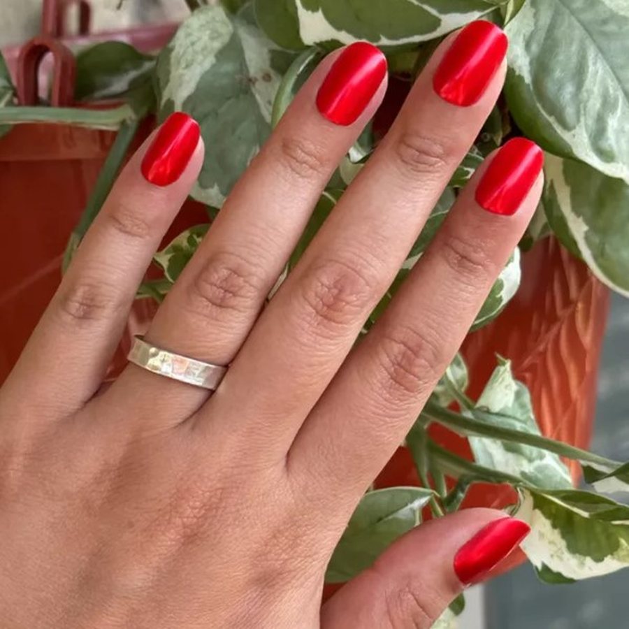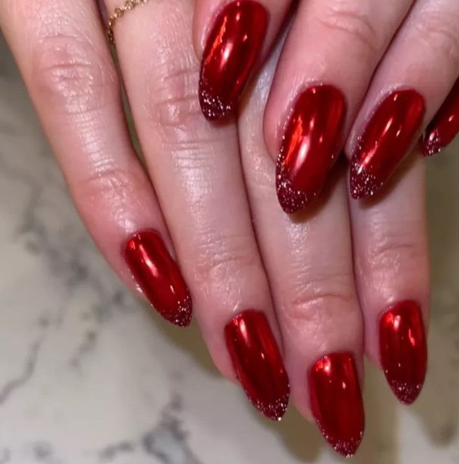 Насыщенный красный под зеркальным хромом - блеск, который заметят на любой вечеринке.